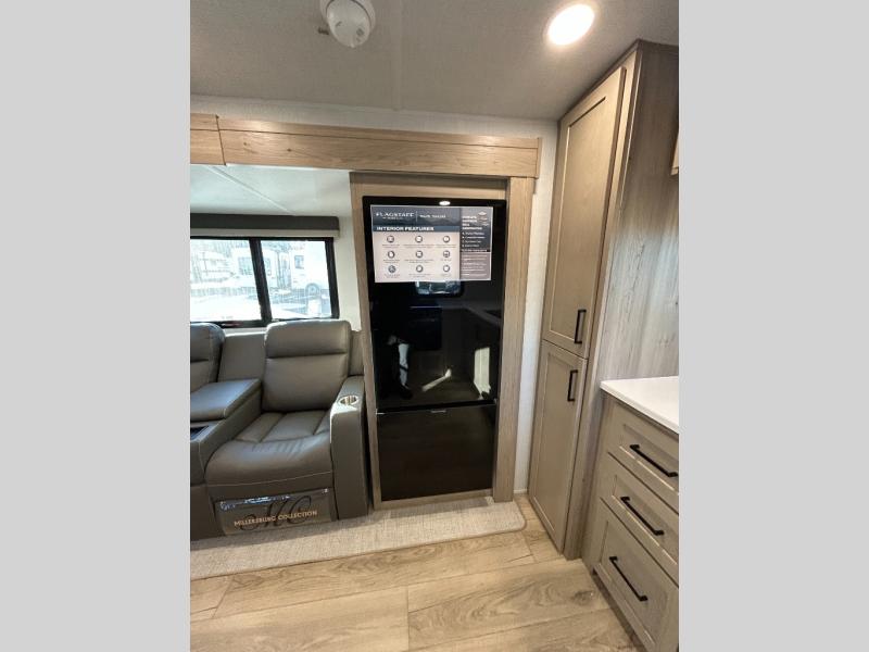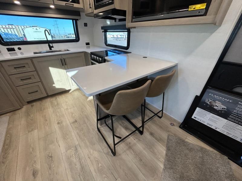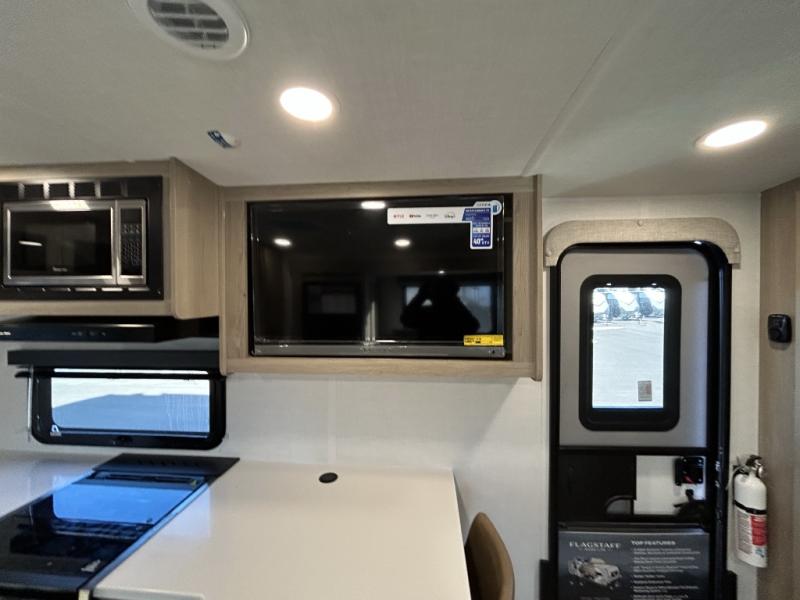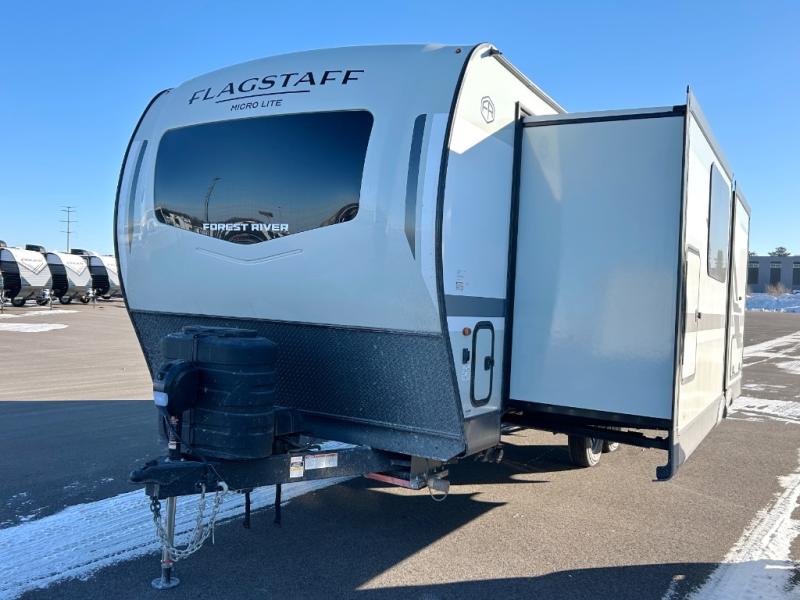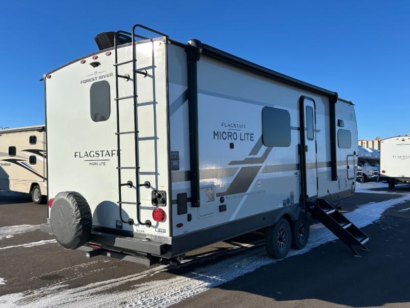 With any Flagstaff Micro Lite travel trailer by Forest River you will enjoy lightweight towing, durable construction, and added interior comforts to make each trip memorable! Each model features RoadTech tire pressure monitoring, Dexter Torflex axles, and nitrogen-filled Goodyear endurance tires for smooth towing from home to campground. The 6-sided aluminum framed construction provides a strong foundation so you can enjoy your RV for years to come, plus the radiant foil in the front cap, underbelly and slides help insulate your trailer. Additional exterior features include a 200W solar panel, back-up camera prep, frameless windows, and slam baggage doors. Each model includes the Great Expectations Package with roller shades, solid surface kitchen countertops, and hidden hinge cabinet doors. There is also an exterior hot/cold water port, outside speakers, a power tongue jack and stabilizer jacks, plus many more conveniences.