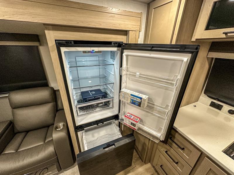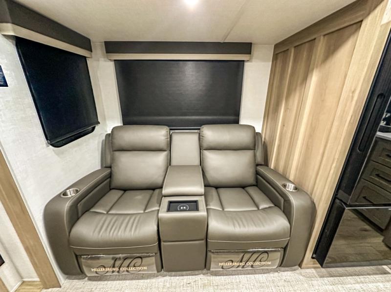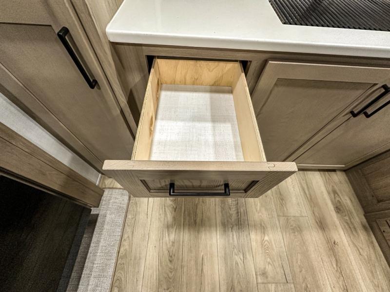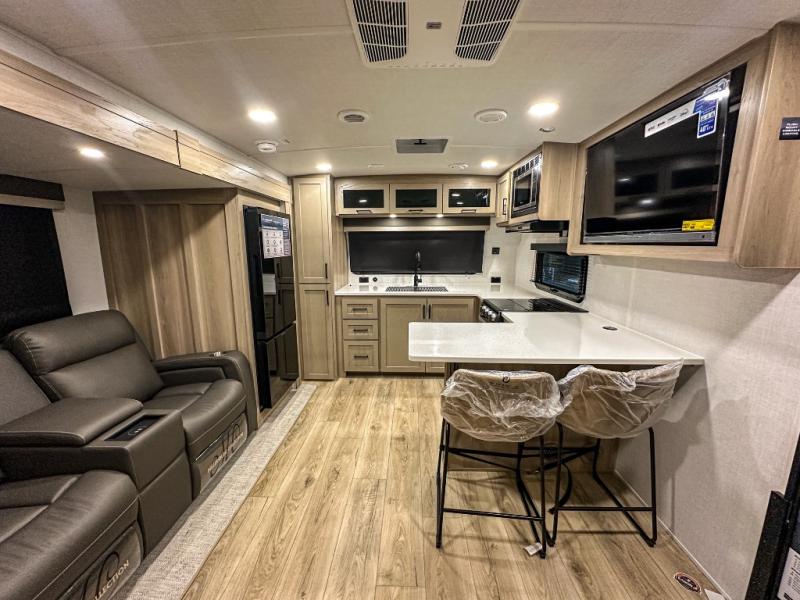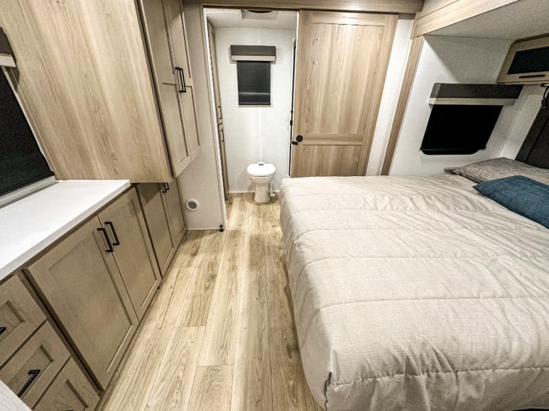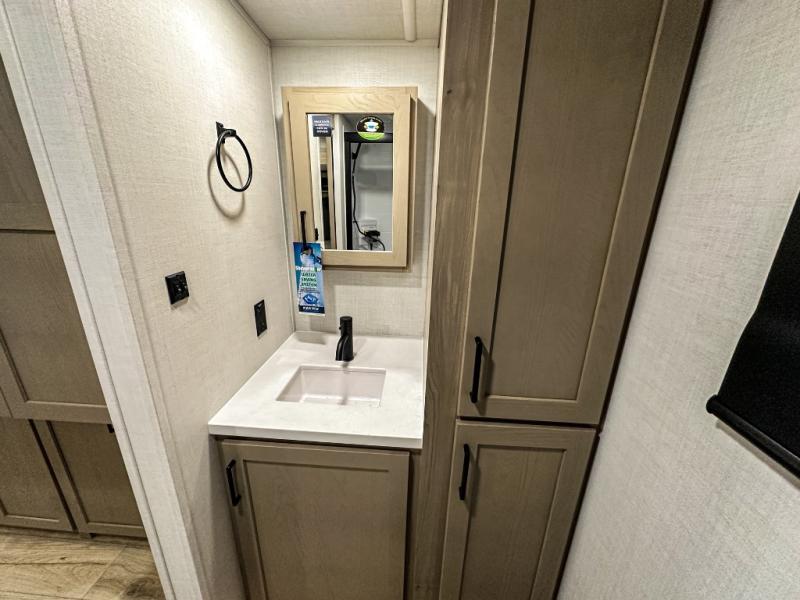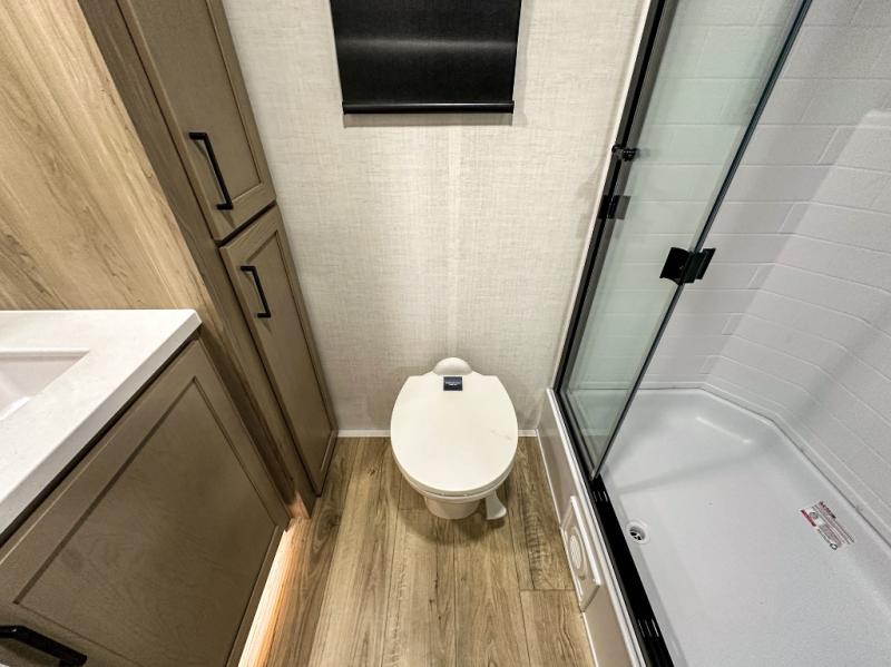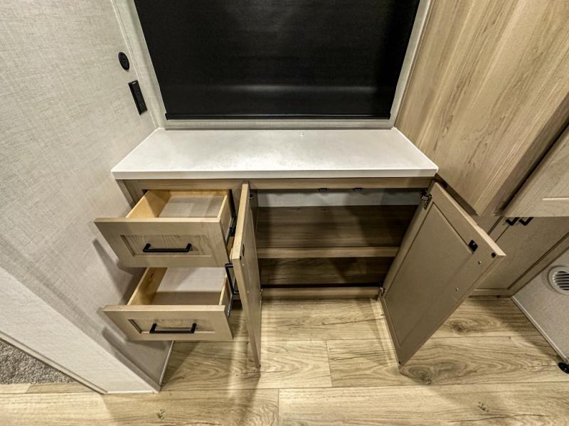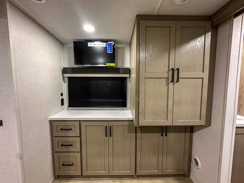 This front kitchen travel trailer is sure to make all your camping wishes come true. It's perfect for a couple since there is a master bedroom with a 60" x 80" queen bed, plus a theater seat in the main living area. If you're needing additional sleeping spaces, just choose the optional hide-a-bed sofa in place of the theater seat. The generous counter space in the kitchen will give you plenty of space to prep meals, and there is a bartop with stools where you can dine together. Along with the queen bed slide, the bedroom also includes a dresser, a TV option, plus a wardrobe with washer and dryer prep if you choose to add these appliances. And don't overlook the full rear bath to freshen up each day!