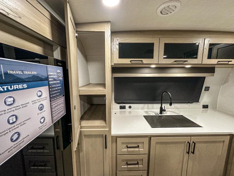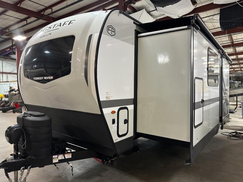 With any Flagstaff Micro Lite travel trailer by Forest River you will enjoy lightweight towing, durable construction, and added interior comforts to make each trip memorable! Each model features RoadTech tire pressure monitoring, Dexter Torflex axles, and nitrogen-filled Goodyear endurance tires for smooth towing from home to campground. The 6-sided aluminum framed construction provides a strong foundation so you can enjoy your RV for years to come, plus the radiant foil in the front cap, underbelly and slides help insulate your trailer. Additional exterior features include a 200W solar panel, back-up camera prep, frameless windows, and slam baggage doors. Each model includes the Great Expectations Package with roller shades, solid surface kitchen countertops, and hidden hinge cabinet doors. There is also an exterior hot/cold water port, outside speakers, a power tongue jack and stabilizer jacks, plus many more conveniences.