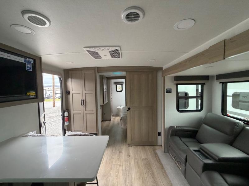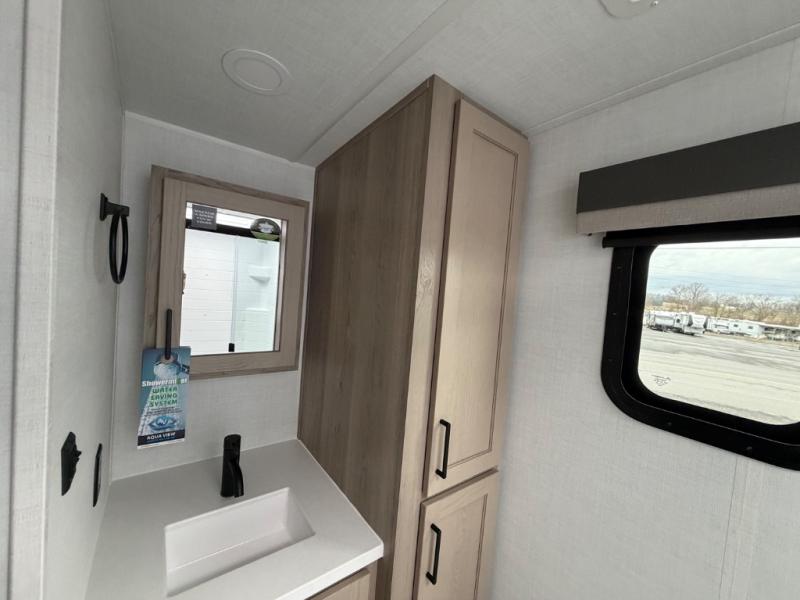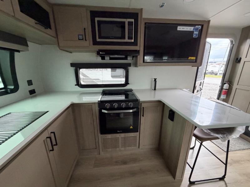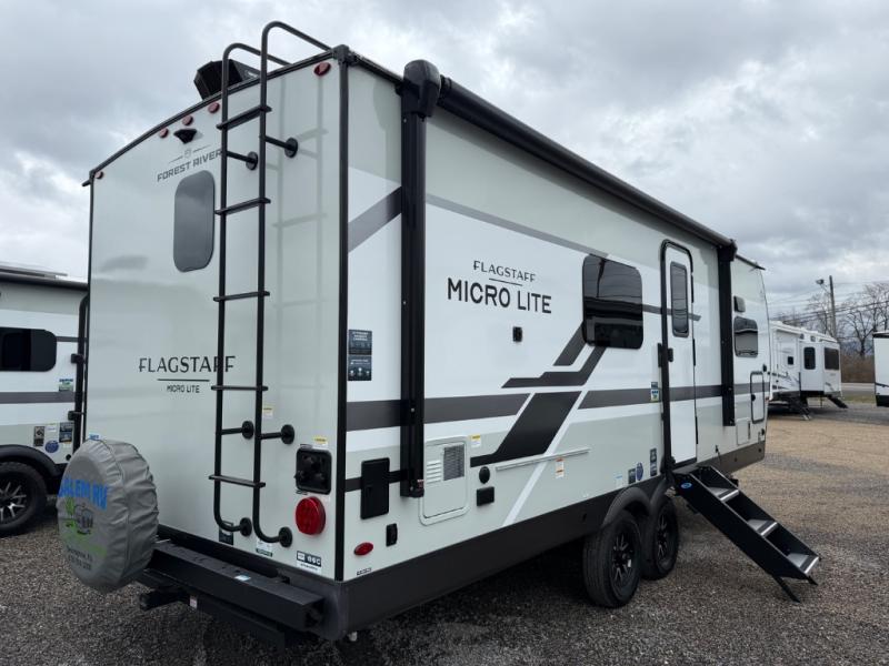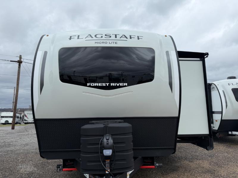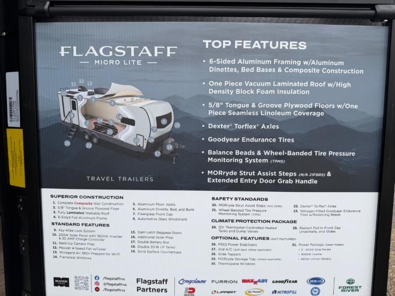 With any Flagstaff Micro Lite travel trailer by Forest River you will enjoy lightweight towing, durable construction, and added interior comforts to make each trip memorable! Each model features RoadTech tire pressure monitoring, Dexter Torflex axles, and nitrogen-filled Goodyear endurance tires for smooth towing from home to campground. The 6-sided aluminum framed construction provides a strong foundation so you can enjoy your RV for years to come, plus the radiant foil in the front cap, underbelly and slides help insulate your trailer. Additional exterior features include a 200W solar panel, back-up camera prep, frameless windows, and slam baggage doors. Each model includes the Great Expectations Package with roller shades, solid surface kitchen countertops, and hidden hinge cabinet doors. There is also an exterior hot/cold water port, outside speakers, a power tongue jack and stabilizer jacks, plus many more conveniences.