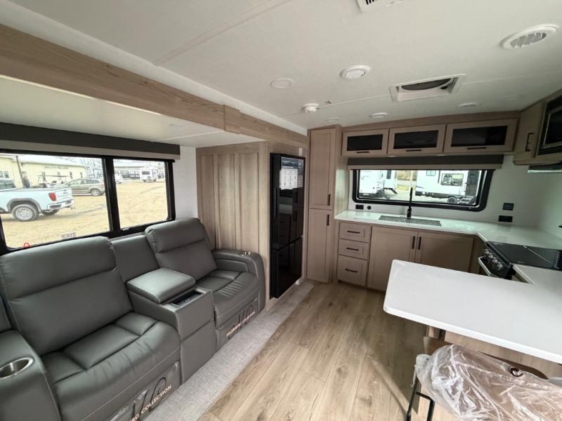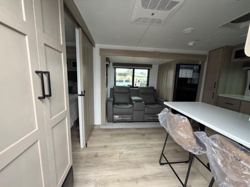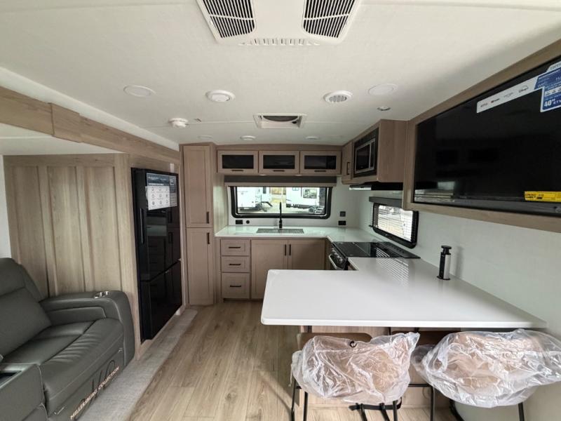 This front kitchen travel trailer is sure to make all your camping wishes come true. It's perfect for a couple since there is a master bedroom with a 60" x 80" queen bed, plus a theater seat in the main living area. If you're needing additional sleeping spaces, just choose the optional hide-a-bed sofa in place of the theater seat. The generous counter space in the kitchen will give you plenty of space to prep meals, and there is a bartop with stools where you can dine together. Along with the queen bed slide, the bedroom also includes a dresser, a TV option, plus a wardrobe with washer and dryer prep if you choose to add these appliances. And don't overlook the full rear bath to freshen up each day!