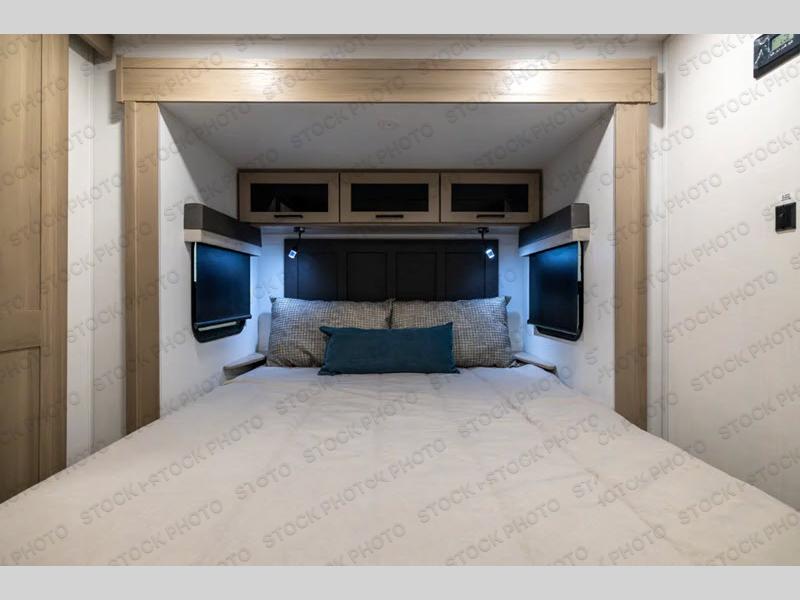 This front kitchen travel trailer is sure to make all your camping wishes come true. It's perfect for a couple since there is a master bedroom with a 60" x 80" queen bed, plus a theater seat in the main living area. If you're needing additional sleeping spaces, just choose the optional hide-a-bed sofa in place of the theater seat. The generous counter space in the kitchen will give you plenty of space to prep meals, and there is a bartop with stools where you can dine together. Along with the queen bed slide, the bedroom also includes a dresser, a TV option, plus a wardrobe with washer and dryer prep if you choose to add these appliances. And don't overlook the full rear bath to freshen up each day!