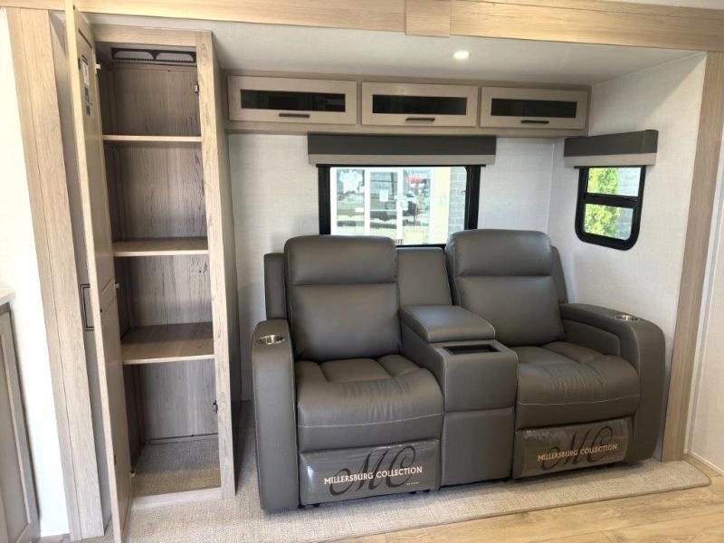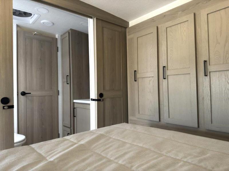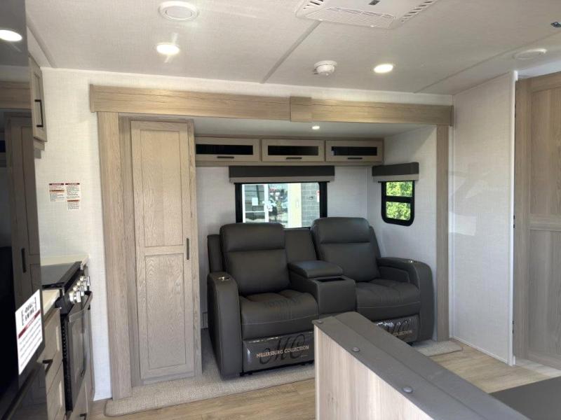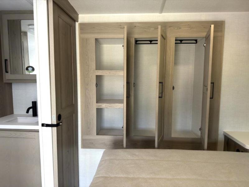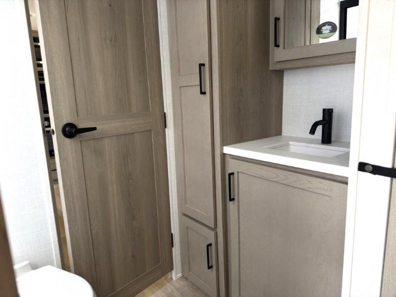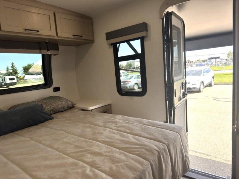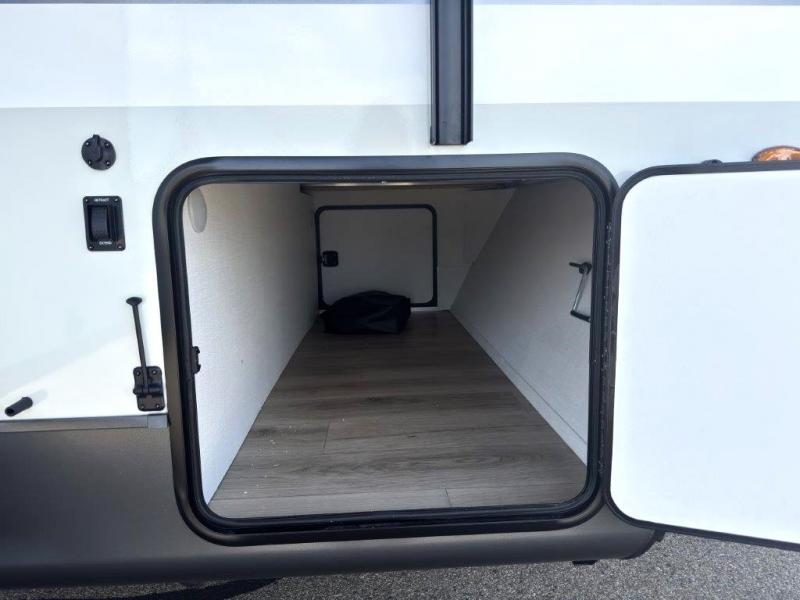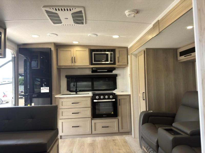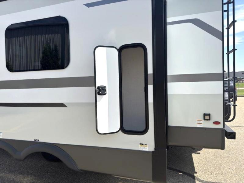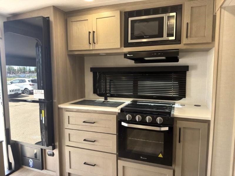Trips to your favorite campground are made complete with this dual slide out, dual entry trailer! One entry goes straight into the front master bedroom where you'll find an RV queen bed with flip-up storage, a wardrobe slide out, and easy access into the walk-through bath. Once you're through the bath, you'll find the main living area, rear kitchen, and the second entry door at the back. Your crew can play a game at the 39" booth dinette or relax on the theater seat across from the TV. The kitchen includes everything you need to prepare meals in the morning, including a three burner cooktop and microwave oven, plus a 12V refrigerator and a pantry for food storage.