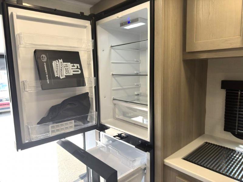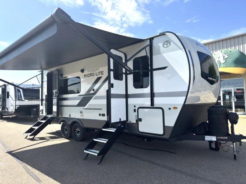 With any Flagstaff Micro Lite travel trailer by Forest River you will enjoy lightweight towing, durable construction, and added interior comforts to make each trip memorable! Each model features RoadTech tire pressure monitoring, Dexter Torflex axles, and nitrogen-filled Goodyear endurance tires for smooth towing from home to campground. The 6-sided aluminum framed construction provides a strong foundation so you can enjoy your RV for years to come, plus the radiant foil in the front cap, underbelly and slides help insulate your trailer. Additional exterior features include a 200W solar panel, back-up camera prep, frameless windows, and slam baggage doors. Each model includes the Great Expectations Package with roller shades, solid surface kitchen countertops, and hidden hinge cabinet doors. There is also an exterior hot/cold water port, outside speakers, a power tongue jack and stabilizer jacks, plus many more conveniences.