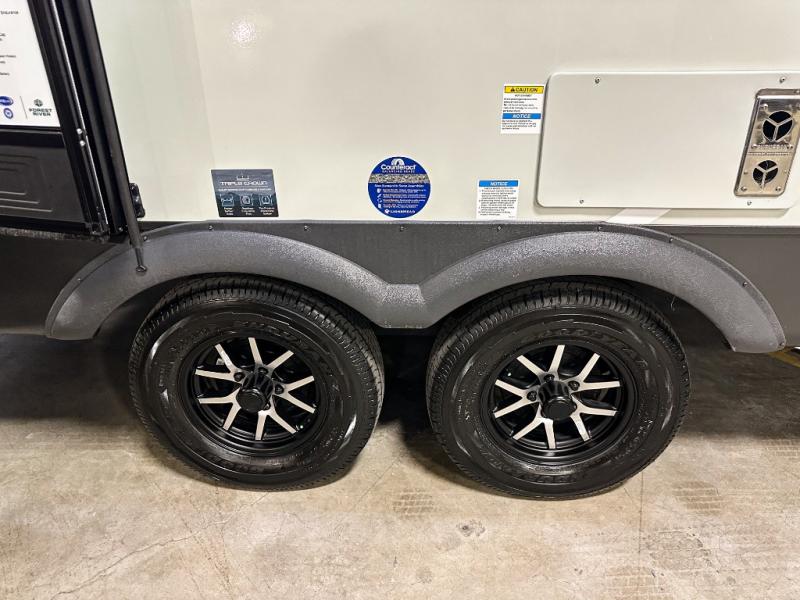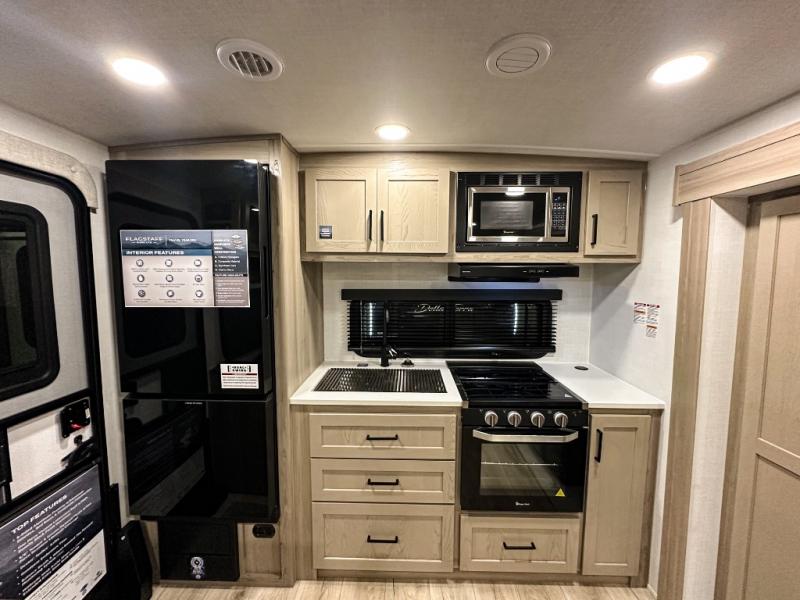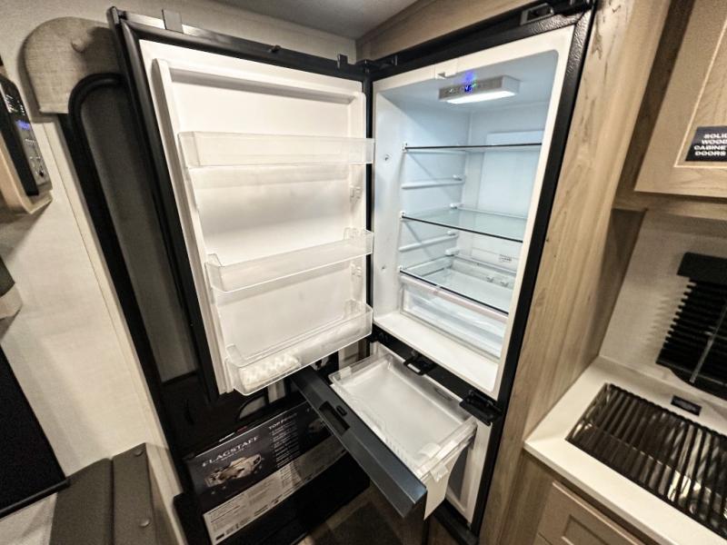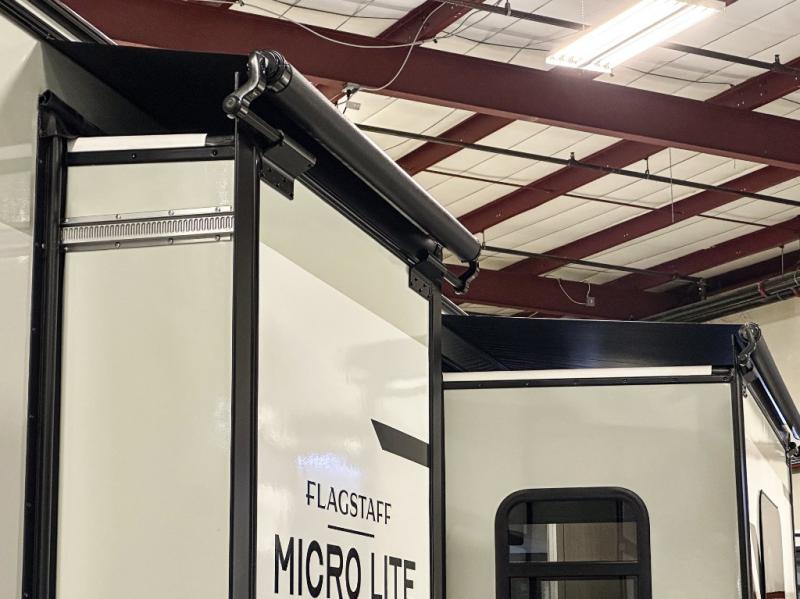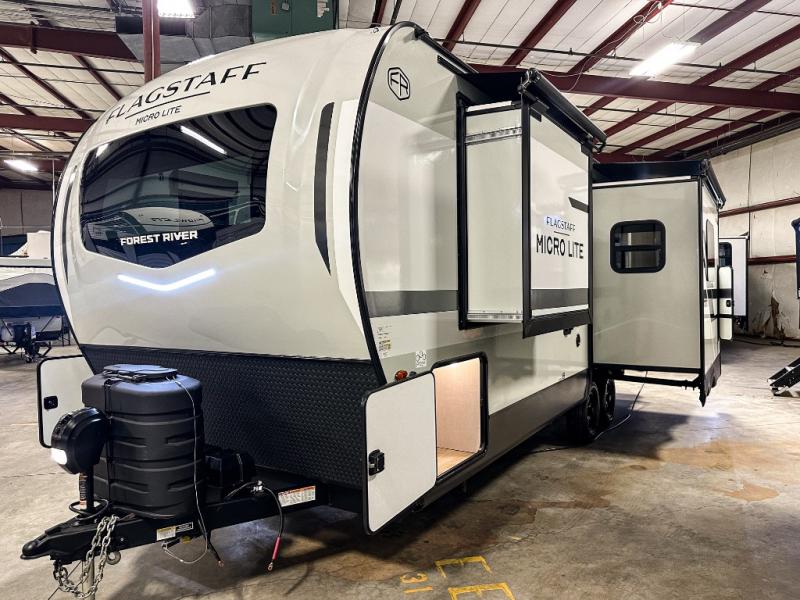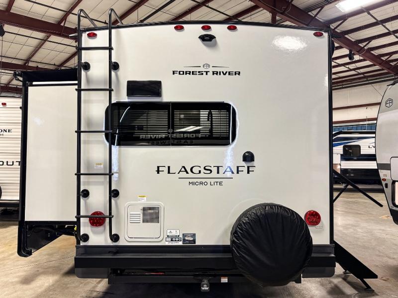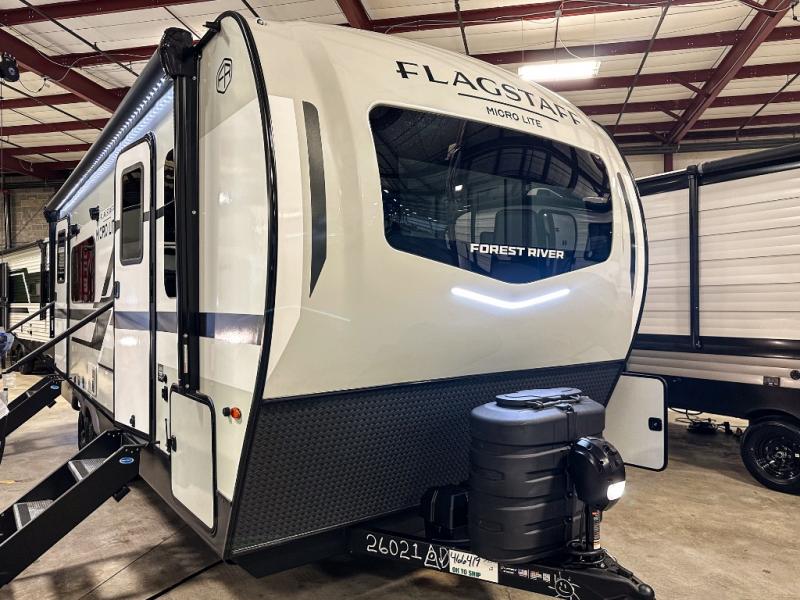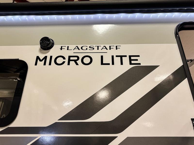 With any Flagstaff Micro Lite travel trailer by Forest River you will enjoy lightweight towing, durable construction, and added interior comforts to make each trip memorable! Each model features RoadTech tire pressure monitoring, Dexter Torflex axles, and nitrogen-filled Goodyear endurance tires for smooth towing from home to campground. The 6-sided aluminum framed construction provides a strong foundation so you can enjoy your RV for years to come, plus the radiant foil in the front cap, underbelly and slides help insulate your trailer. Additional exterior features include a 200W solar panel, back-up camera prep, frameless windows, and slam baggage doors. Each model includes the Great Expectations Package with roller shades, solid surface kitchen countertops, and hidden hinge cabinet doors. There is also an exterior hot/cold water port, outside speakers, a power tongue jack and stabilizer jacks, plus many more conveniences.