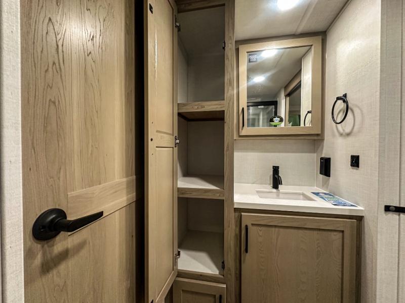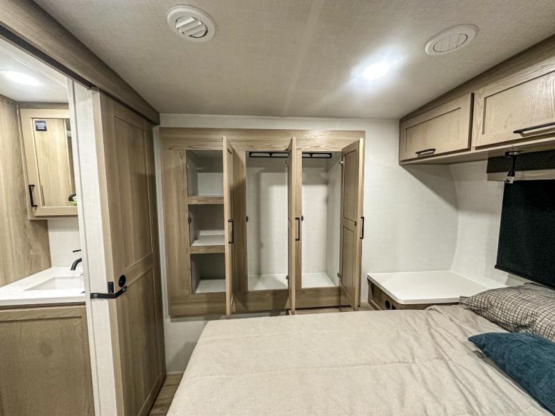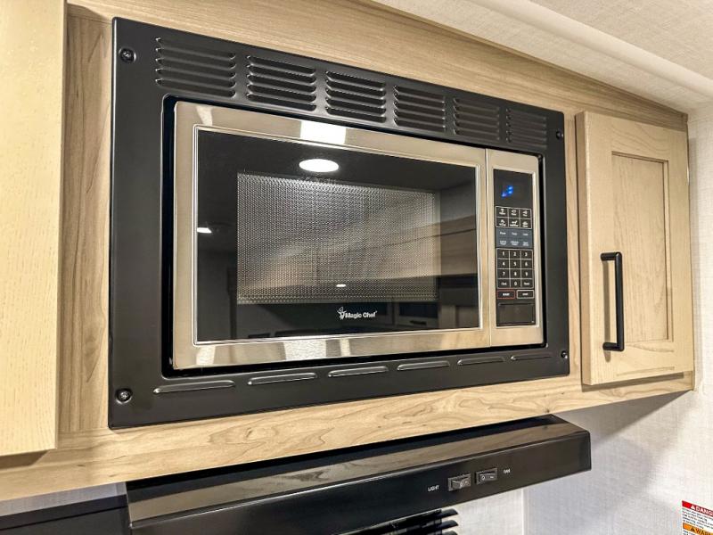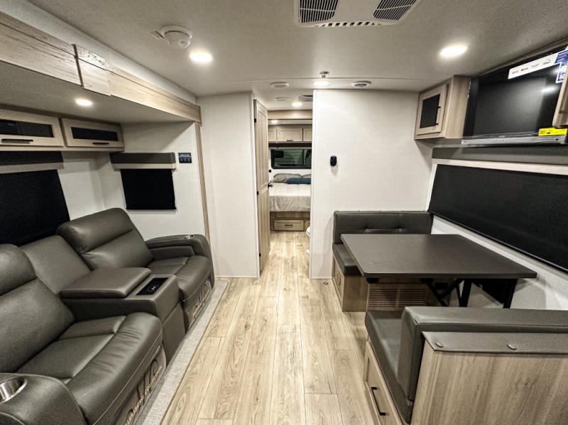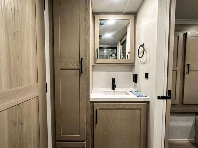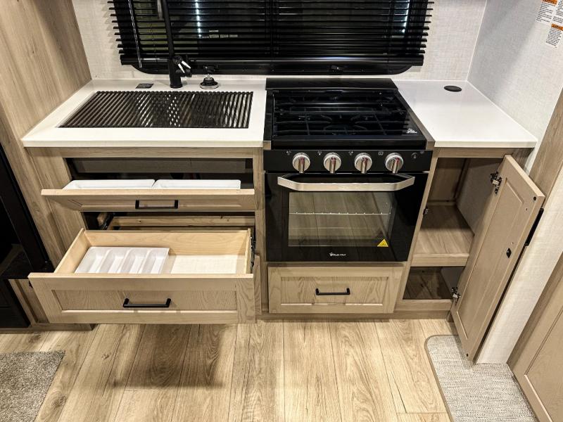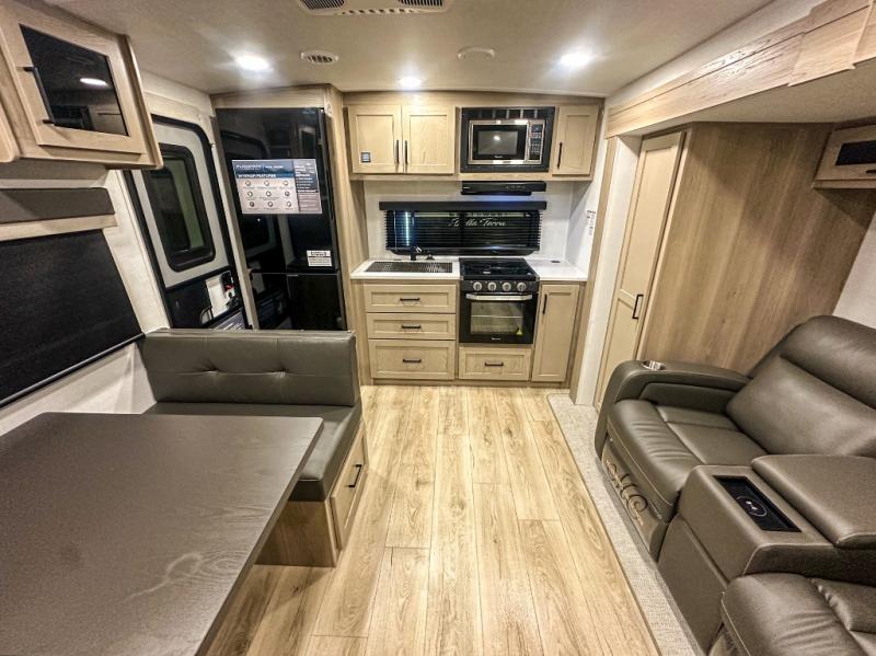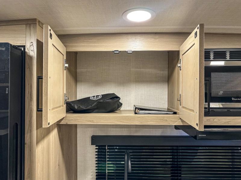 Trips to your favorite campground are made complete with this dual slide out, dual entry trailer! One entry goes straight into the front master bedroom where you'll find an RV queen bed with flip-up storage, a wardrobe slide out, and easy access into the walk-through bath. Once you're through the bath, you'll find the main living area, rear kitchen, and the second entry door at the back. Your crew can play a game at the 39" booth dinette or relax on the theater seat across from the TV. The kitchen includes everything you need to prepare meals in the morning, including a three burner cooktop and microwave oven, plus a 12V refrigerator and a pantry for food storage.