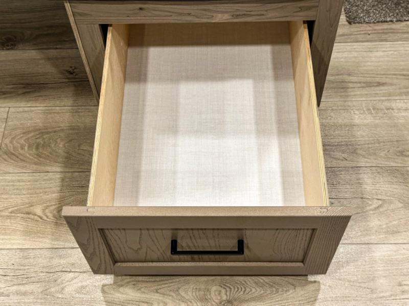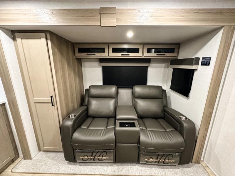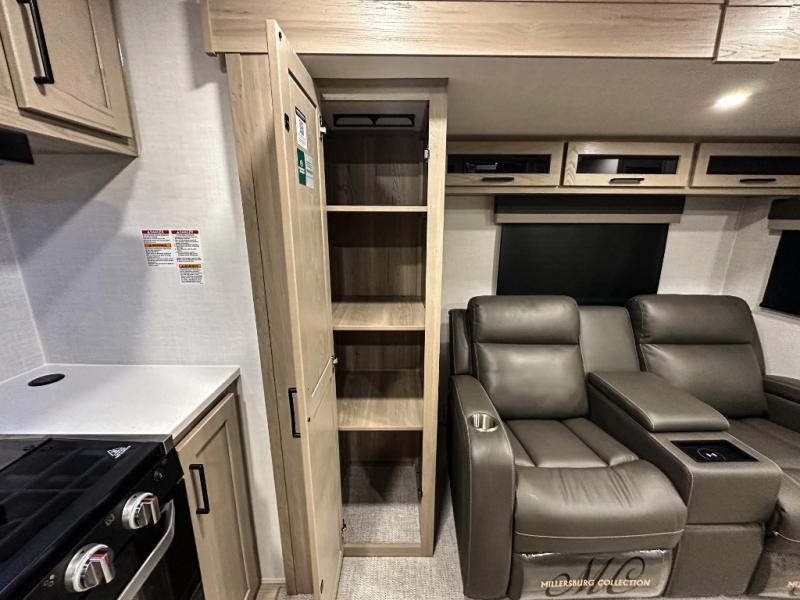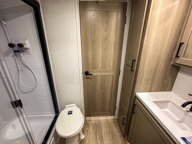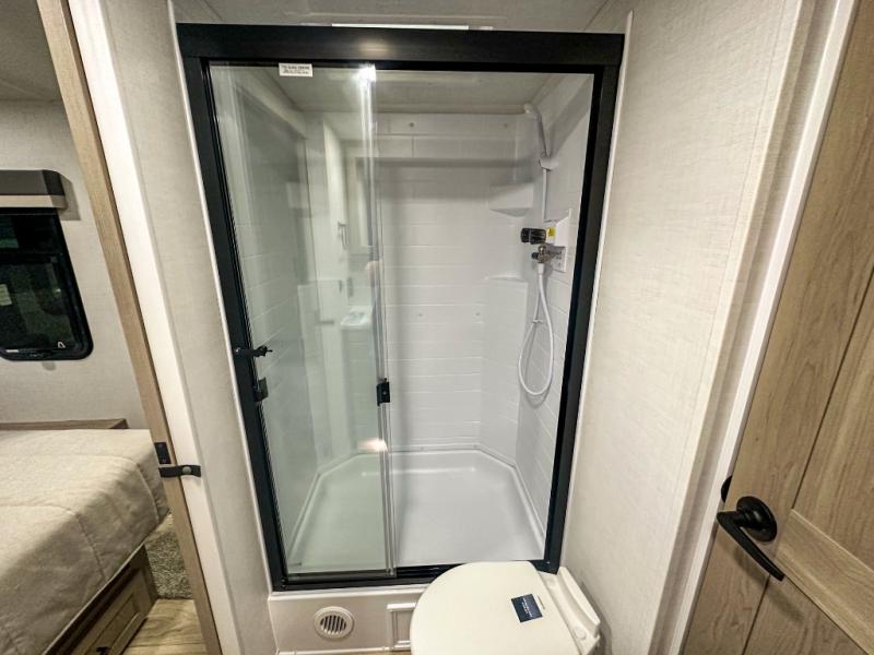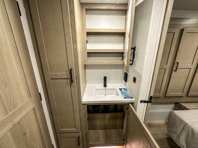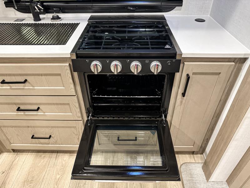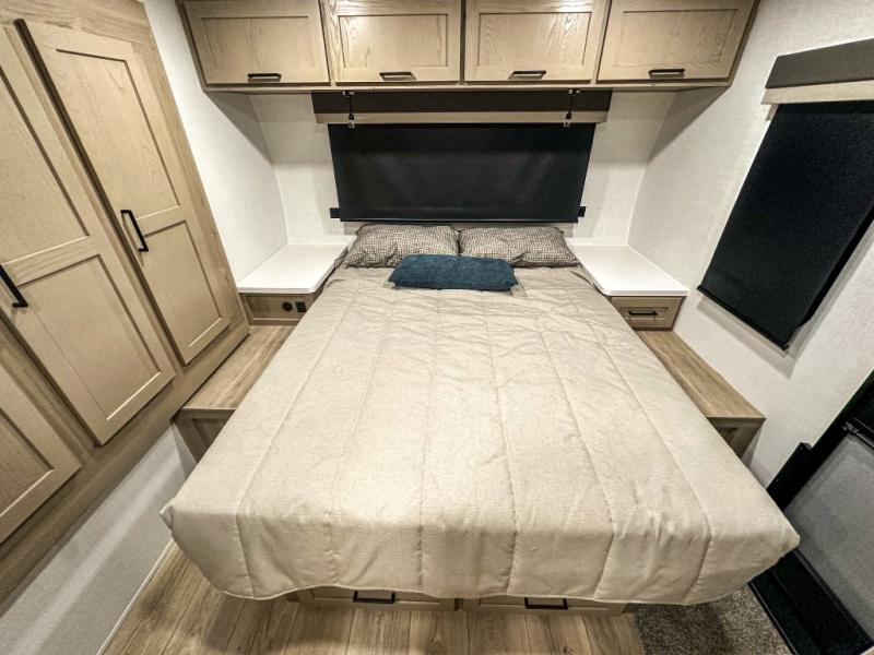 Trips to your favorite campground are made complete with this dual slide out, dual entry trailer! One entry goes straight into the front master bedroom where you'll find an RV queen bed with flip-up storage, a wardrobe slide out, and easy access into the walk-through bath. Once you're through the bath, you'll find the main living area, rear kitchen, and the second entry door at the back. Your crew can play a game at the 39" booth dinette or relax on the theater seat across from the TV. The kitchen includes everything you need to prepare meals in the morning, including a three burner cooktop and microwave oven, plus a 12V refrigerator and a pantry for food storage.