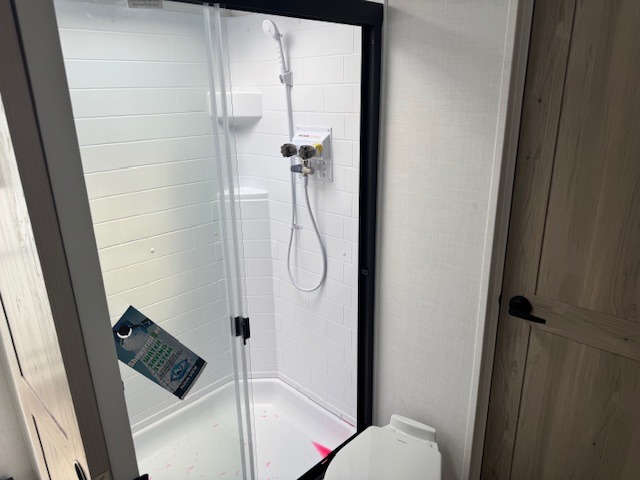 Trips to your favorite campground are made complete with this dual slide out, dual entry trailer! One entry goes straight into the front master bedroom where you'll find an RV queen bed with flip-up storage, a wardrobe slide out, and easy access into the walk-through bath. Once you're through the bath, you'll find the main living area, rear kitchen, and the second entry door at the back. Your crew can play a game at the 39" booth dinette or relax on the theater seat across from the TV. The kitchen includes everything you need to prepare meals in the morning, including a three burner cooktop and microwave oven, plus a 12V refrigerator and a pantry for food storage.