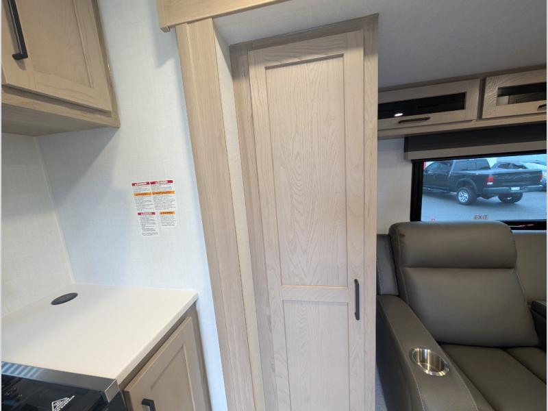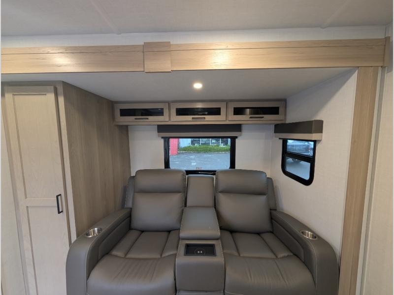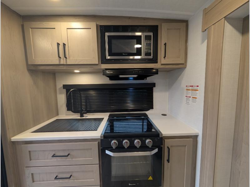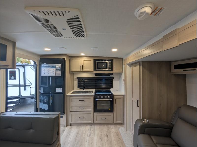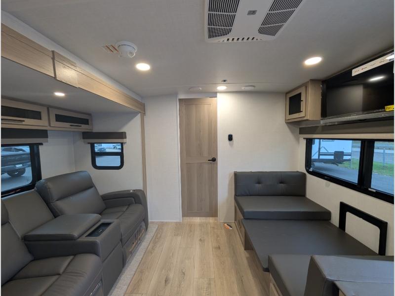 Trips to your favorite campground are made complete with this dual slide out, dual entry trailer! One entry goes straight into the front master bedroom where you'll find an RV queen bed with flip-up storage, a wardrobe slide out, and easy access into the walk-through bath. Once you're through the bath, you'll find the main living area, rear kitchen, and the second entry door at the back. Your crew can play a game at the 39" booth dinette or relax on the theater seat across from the TV. The kitchen includes everything you need to prepare meals in the morning, including a three burner cooktop and microwave oven, plus a 12V refrigerator and a pantry for food storage.