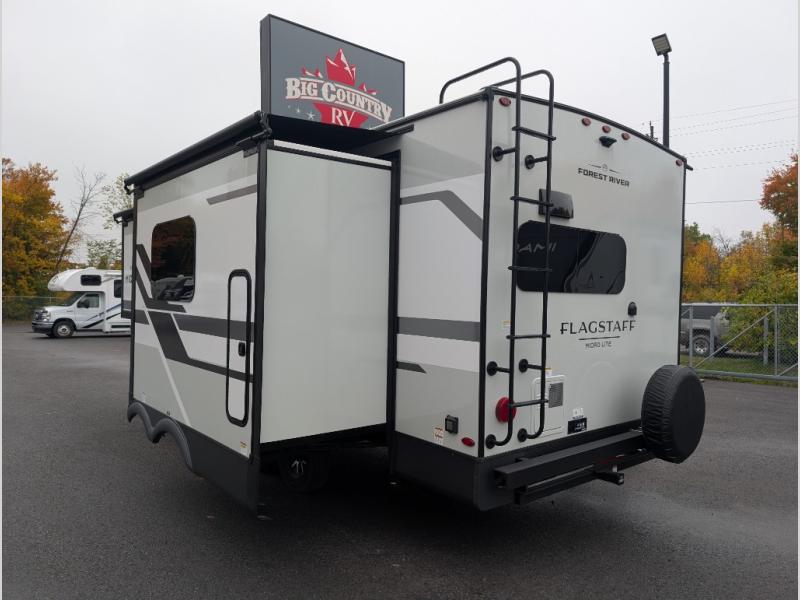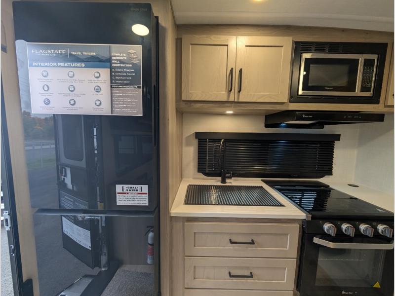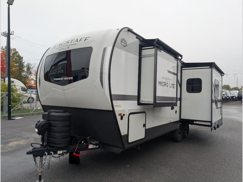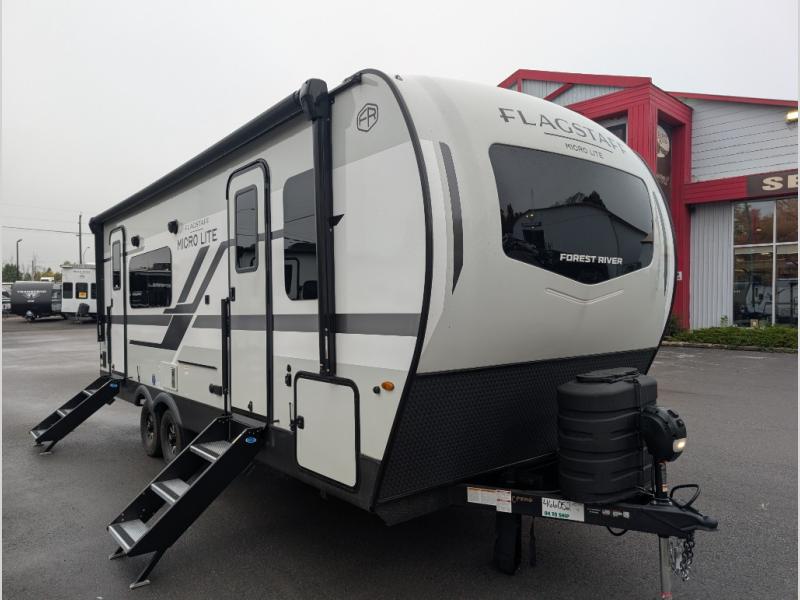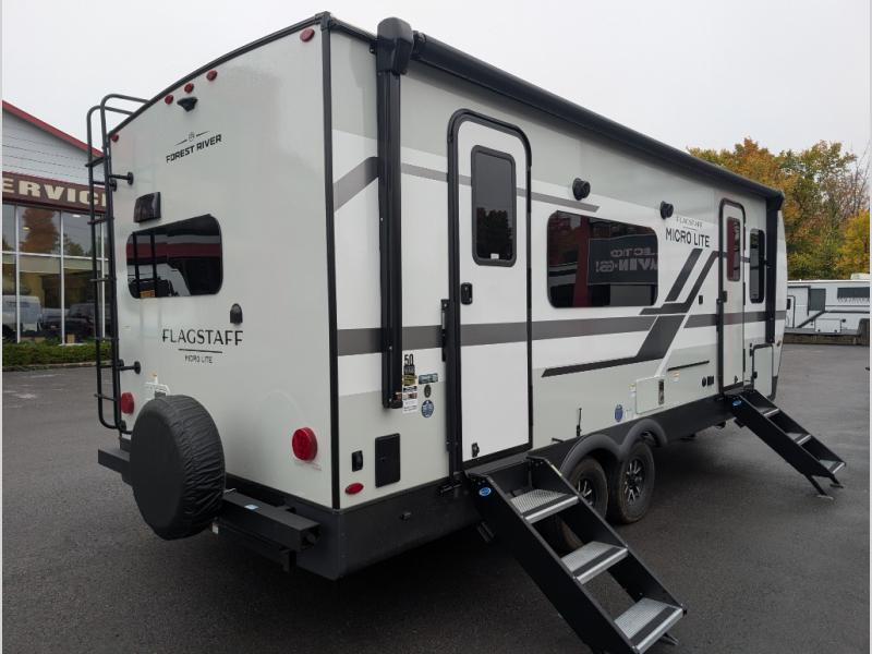 With any Flagstaff Micro Lite travel trailer by Forest River you will enjoy lightweight towing, durable construction, and added interior comforts to make each trip memorable! Each model features RoadTech tire pressure monitoring, Dexter Torflex axles, and nitrogen-filled Goodyear endurance tires for smooth towing from home to campground. The 6-sided aluminum framed construction provides a strong foundation so you can enjoy your RV for years to come, plus the radiant foil in the front cap, underbelly and slides help insulate your trailer. Additional exterior features include a 200W solar panel, back-up camera prep, frameless windows, and slam baggage doors. Each model includes the Great Expectations Package with roller shades, solid surface kitchen countertops, and hidden hinge cabinet doors. There is also an exterior hot/cold water port, outside speakers, a power tongue jack and stabilizer jacks, plus many more conveniences.