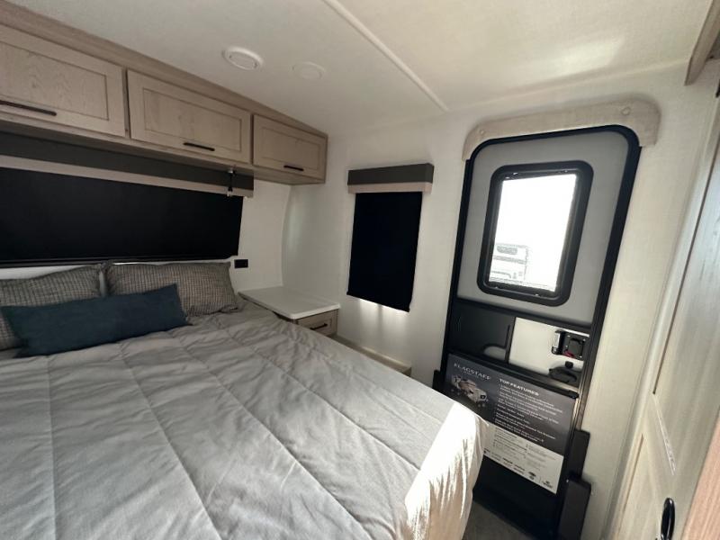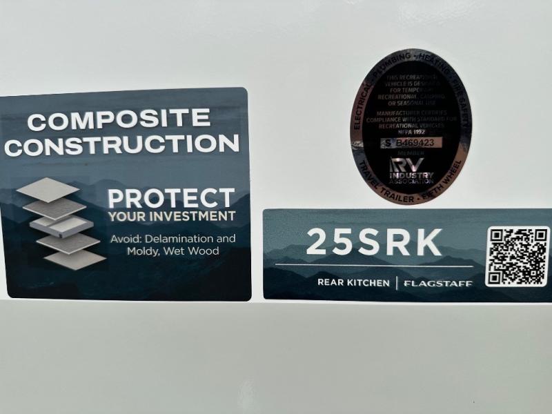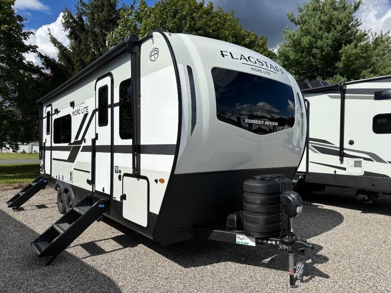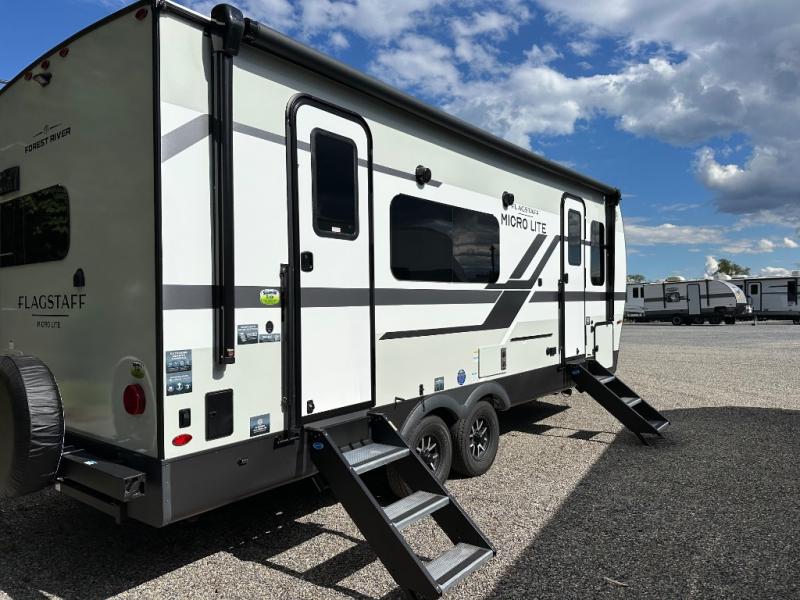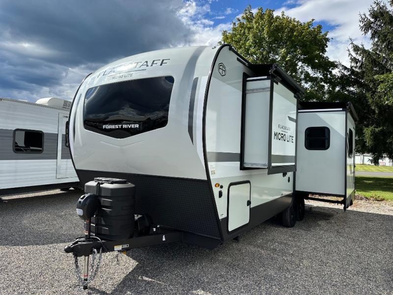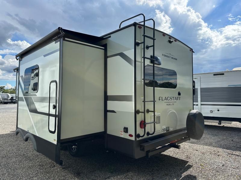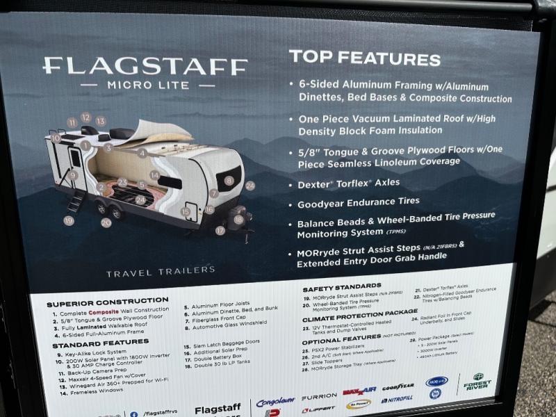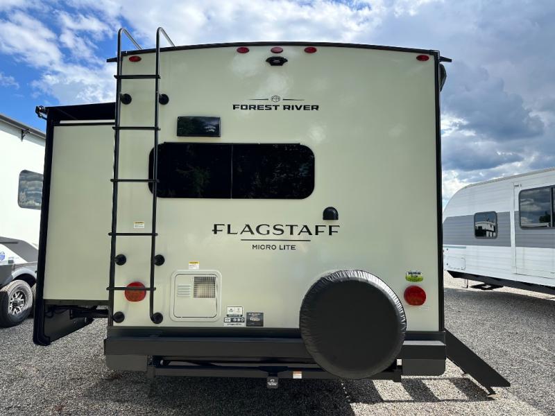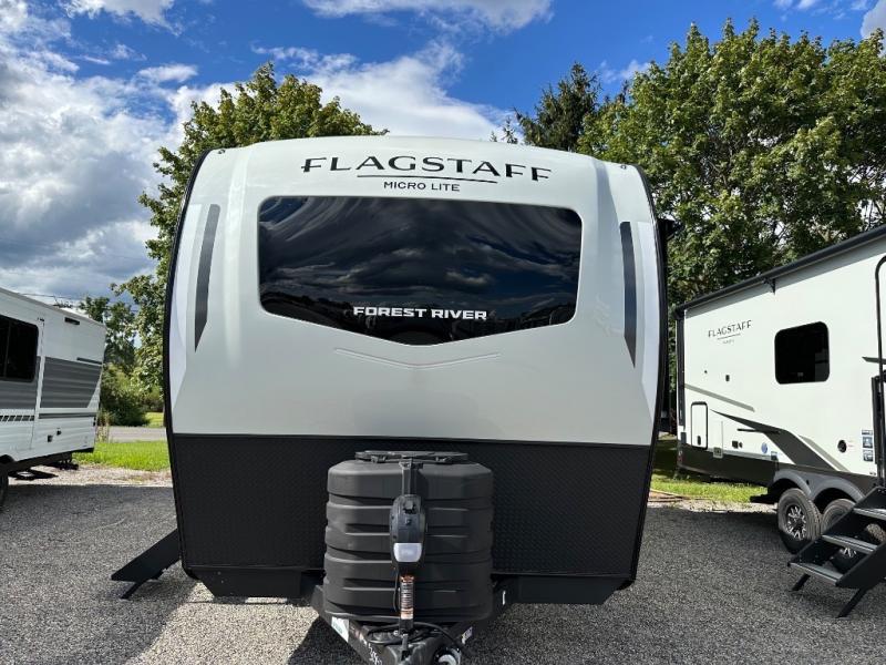 With any Flagstaff Micro Lite travel trailer by Forest River you will enjoy lightweight towing, durable construction, and added interior comforts to make each trip memorable! Each model features RoadTech tire pressure monitoring, Dexter Torflex axles, and nitrogen-filled Goodyear endurance tires for smooth towing from home to campground. The 6-sided aluminum framed construction provides a strong foundation so you can enjoy your RV for years to come, plus the radiant foil in the front cap, underbelly and slides help insulate your trailer. Additional exterior features include a 200W solar panel, back-up camera prep, frameless windows, and slam baggage doors. Each model includes the Great Expectations Package with roller shades, solid surface kitchen countertops, and hidden hinge cabinet doors. There is also an exterior hot/cold water port, outside speakers, a power tongue jack and stabilizer jacks, plus many more conveniences.