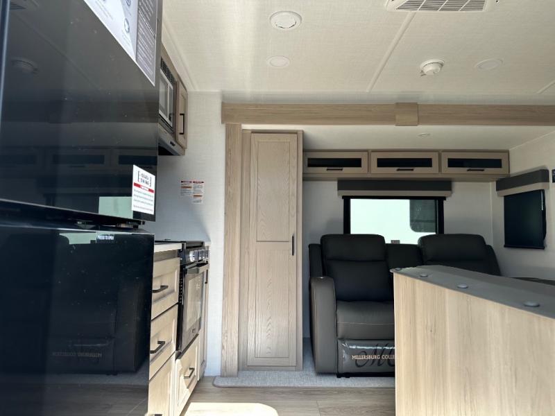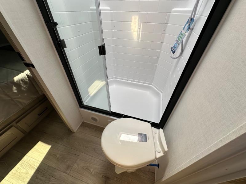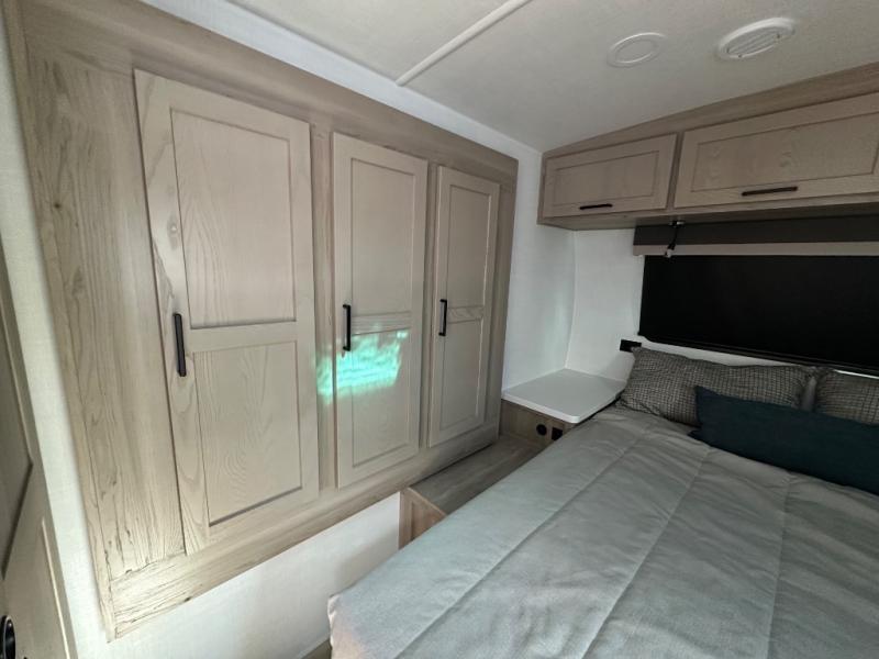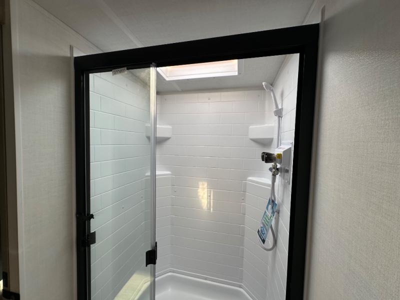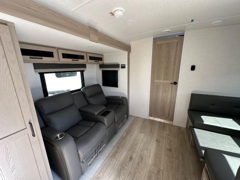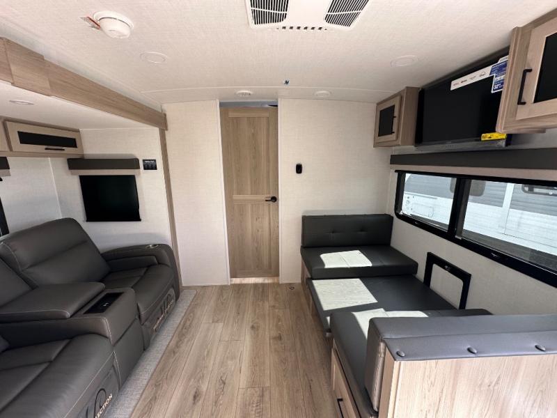 Trips to your favorite campground are made complete with this dual slide out, dual entry trailer! One entry goes straight into the front master bedroom where you'll find an RV queen bed with flip-up storage, a wardrobe slide out, and easy access into the walk-through bath. Once you're through the bath, you'll find the main living area, rear kitchen, and the second entry door at the back. Your crew can play a game at the 39" booth dinette or relax on the theater seat across from the TV. The kitchen includes everything you need to prepare meals in the morning, including a three burner cooktop and microwave oven, plus a 12V refrigerator and a pantry for food storage.