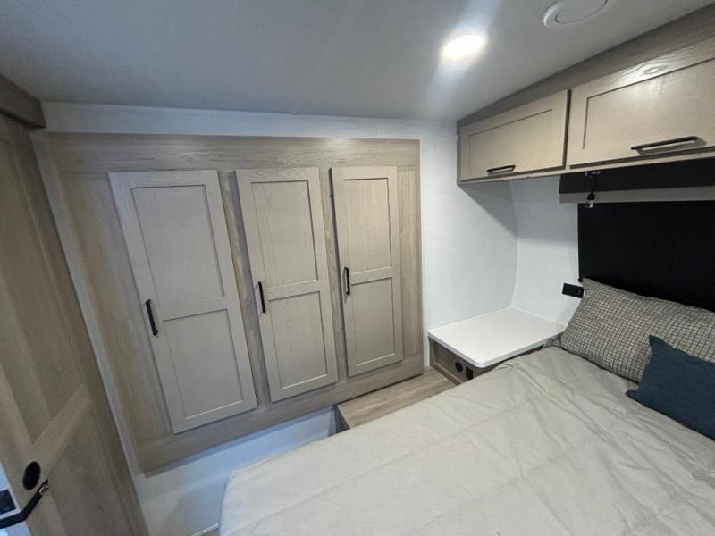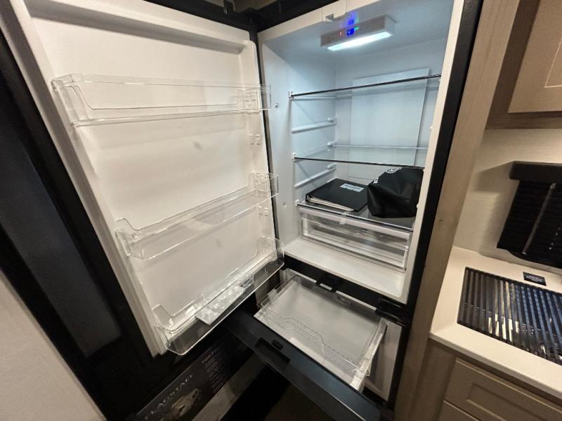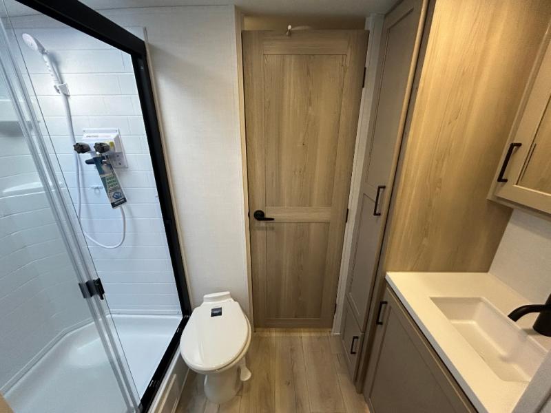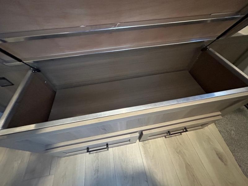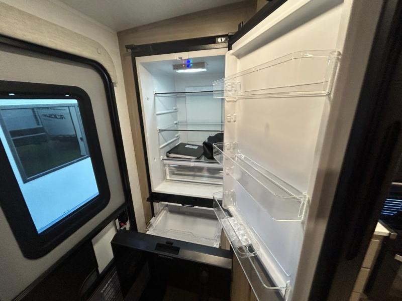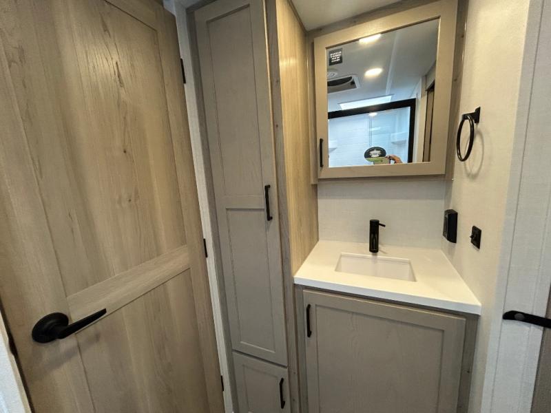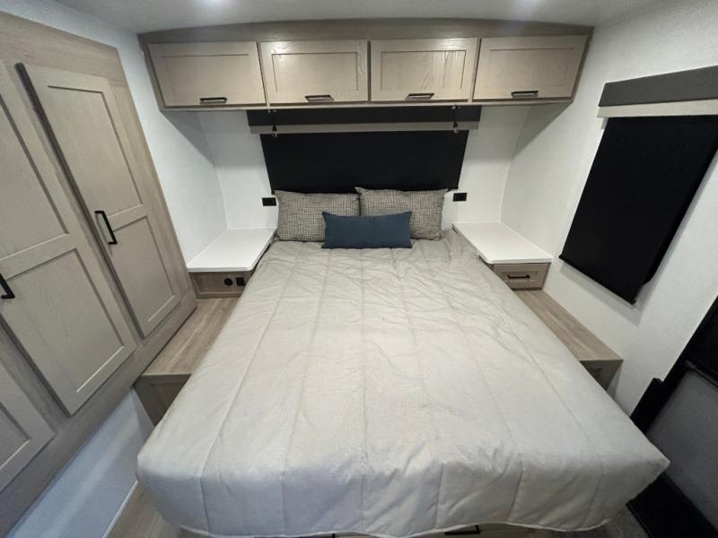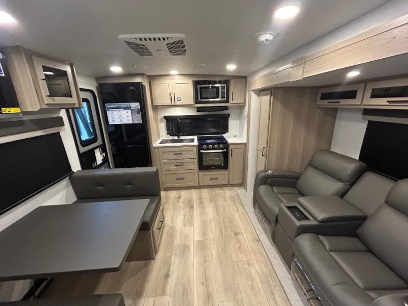 Trips to your favorite campground are made complete with this dual slide out, dual entry trailer! One entry goes straight into the front master bedroom where you'll find an RV queen bed with flip-up storage, a wardrobe slide out, and easy access into the walk-through bath. Once you're through the bath, you'll find the main living area, rear kitchen, and the second entry door at the back. Your crew can play a game at the 39" booth dinette or relax on the theater seat across from the TV. The kitchen includes everything you need to prepare meals in the morning, including a three burner cooktop and microwave oven, plus a 12V refrigerator and a pantry for food storage.
