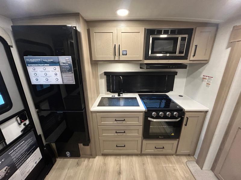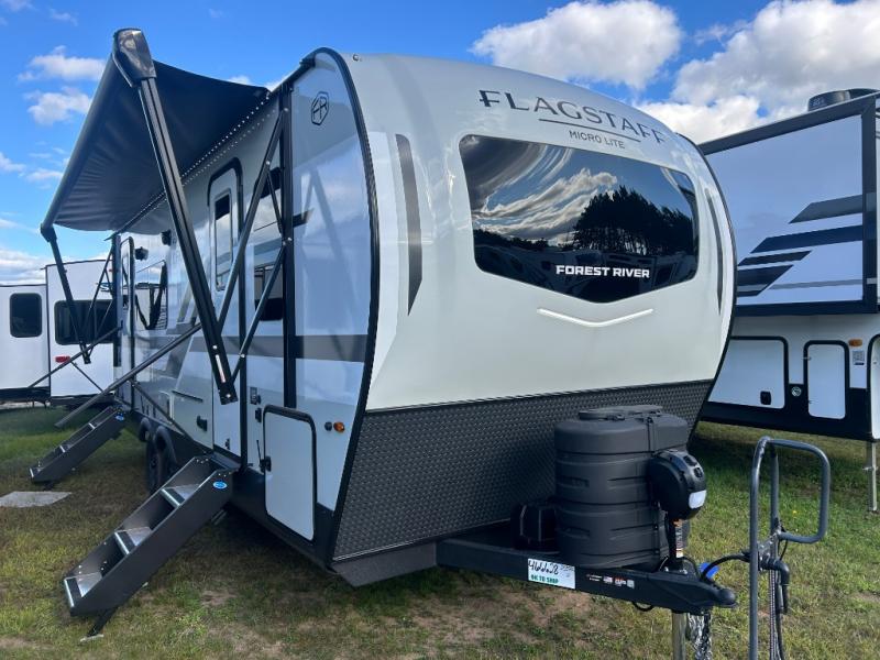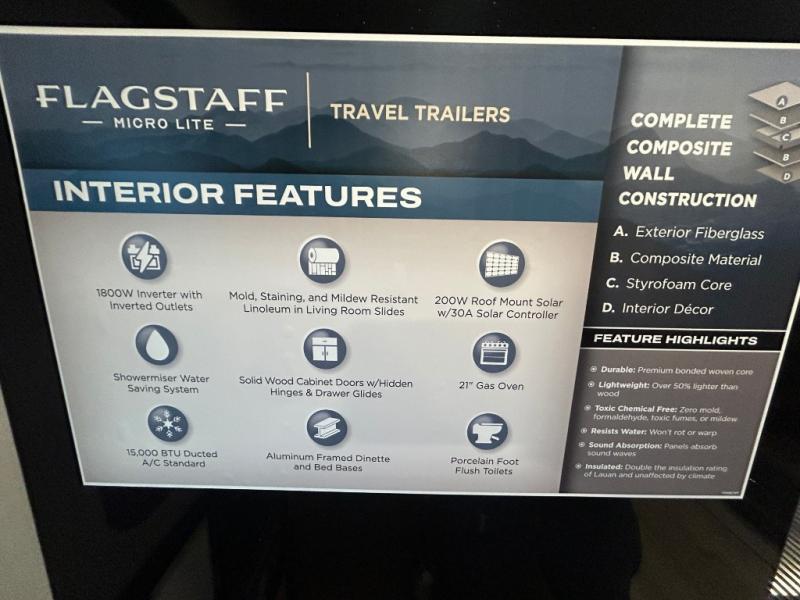 With any Flagstaff Micro Lite travel trailer by Forest River you will enjoy lightweight towing, durable construction, and added interior comforts to make each trip memorable! Each model features RoadTech tire pressure monitoring, Dexter Torflex axles, and nitrogen-filled Goodyear endurance tires for smooth towing from home to campground. The 6-sided aluminum framed construction provides a strong foundation so you can enjoy your RV for years to come, plus the radiant foil in the front cap, underbelly and slides help insulate your trailer. Additional exterior features include a 200W solar panel, back-up camera prep, frameless windows, and slam baggage doors. Each model includes the Great Expectations Package with roller shades, solid surface kitchen countertops, and hidden hinge cabinet doors. There is also an exterior hot/cold water port, outside speakers, a power tongue jack and stabilizer jacks, plus many more conveniences.
