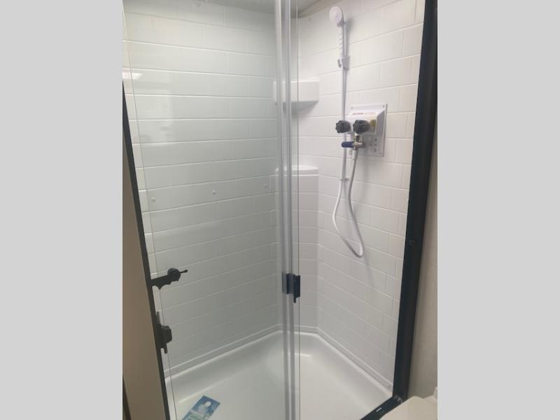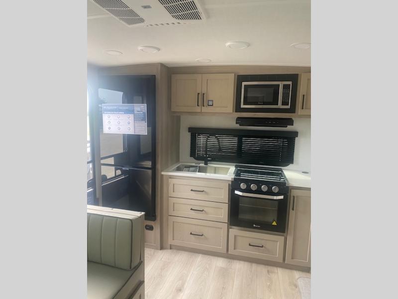 Trips to your favorite campground are made complete with this dual slide out, dual entry trailer! One entry goes straight into the front master bedroom where you'll find an RV queen bed with flip-up storage, a wardrobe slide out, and easy access into the walk-through bath. Once you're through the bath, you'll find the main living area, rear kitchen, and the second entry door at the back. Your crew can play a game at the 39" booth dinette or relax on the theater seat across from the TV. The kitchen includes everything you need to prepare meals in the morning, including a three burner cooktop and microwave oven, plus a 12V refrigerator and a pantry for food storage.