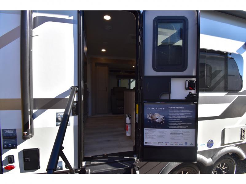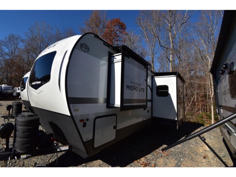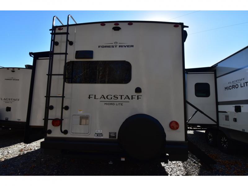 With any Flagstaff Micro Lite travel trailer by Forest River you will enjoy lightweight towing, durable construction, and added interior comforts to make each trip memorable! Each model features RoadTech tire pressure monitoring, Dexter Torflex axles, and nitrogen-filled Goodyear endurance tires for smooth towing from home to campground. The 6-sided aluminum framed construction provides a strong foundation so you can enjoy your RV for years to come, plus the radiant foil in the front cap, underbelly and slides help insulate your trailer. Additional exterior features include a 200W solar panel, back-up camera prep, frameless windows, and slam baggage doors. Each model includes the Great Expectations Package with roller shades, solid surface kitchen countertops, and hidden hinge cabinet doors. There is also an exterior hot/cold water port, outside speakers, a power tongue jack and stabilizer jacks, plus many more conveniences.