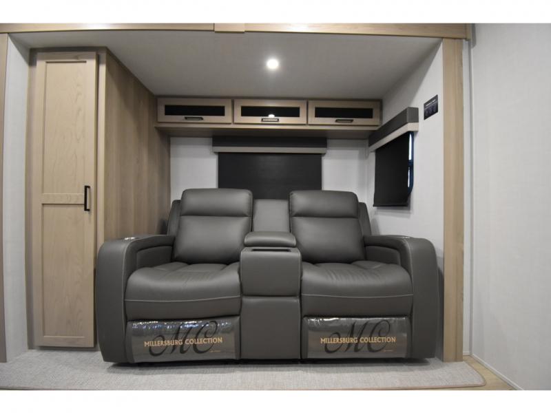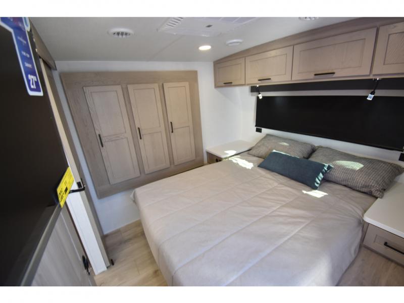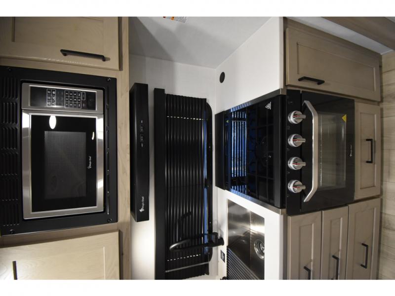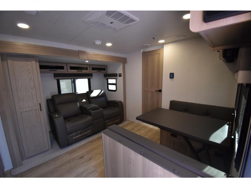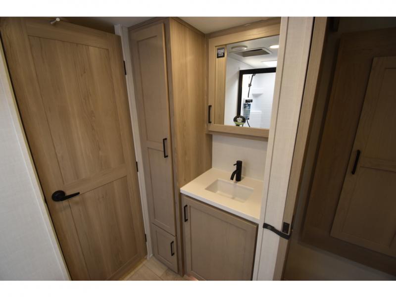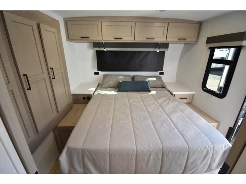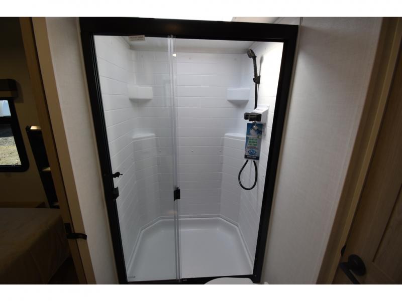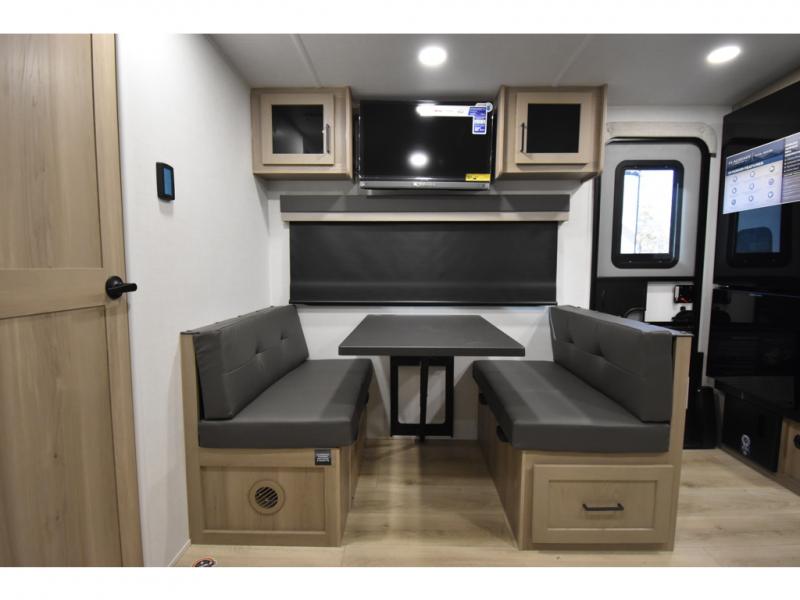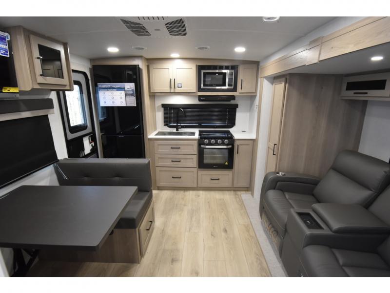 Trips to your favorite campground are made complete with this dual slide out, dual entry trailer! One entry goes straight into the front master bedroom where you'll find an RV queen bed with flip-up storage, a wardrobe slide out, and easy access into the walk-through bath. Once you're through the bath, you'll find the main living area, rear kitchen, and the second entry door at the back. Your crew can play a game at the 39" booth dinette or relax on the theater seat across from the TV. The kitchen includes everything you need to prepare meals in the morning, including a three burner cooktop and microwave oven, plus a 12V refrigerator and a pantry for food storage.