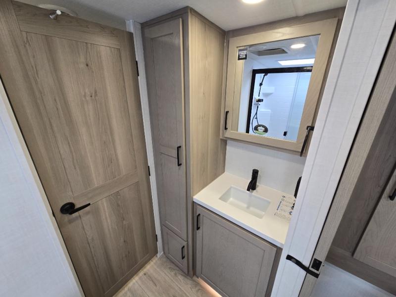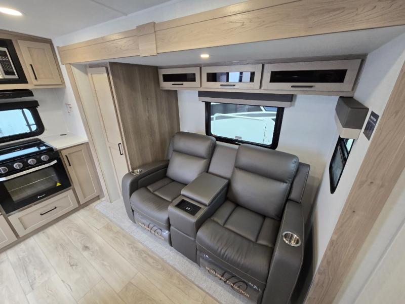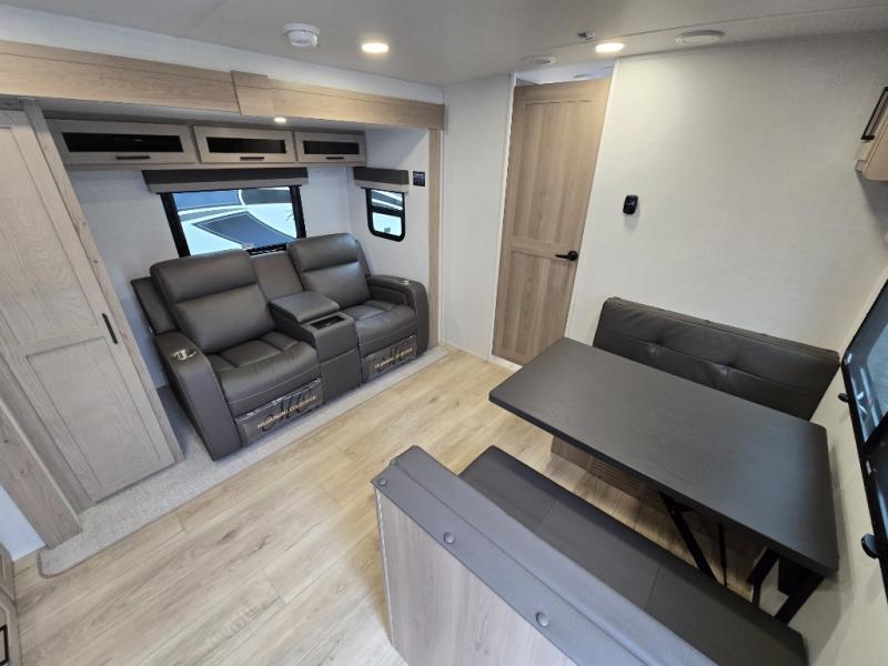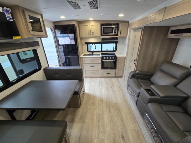 Trips to your favorite campground are made complete with this dual slide out, dual entry trailer! One entry goes straight into the front master bedroom where you'll find an RV queen bed with flip-up storage, a wardrobe slide out, and easy access into the walk-through bath. Once you're through the bath, you'll find the main living area, rear kitchen, and the second entry door at the back. Your crew can play a game at the 39" booth dinette or relax on the theater seat across from the TV. The kitchen includes everything you need to prepare meals in the morning, including a three burner cooktop and microwave oven, plus a 12V refrigerator and a pantry for food storage.