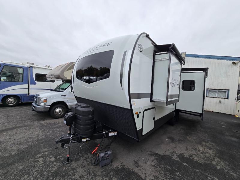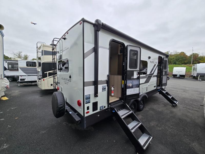 With any Flagstaff Micro Lite travel trailer by Forest River you will enjoy lightweight towing, durable construction, and added interior comforts to make each trip memorable! Each model features RoadTech tire pressure monitoring, Dexter Torflex axles, and nitrogen-filled Goodyear endurance tires for smooth towing from home to campground. The 6-sided aluminum framed construction provides a strong foundation so you can enjoy your RV for years to come, plus the radiant foil in the front cap, underbelly and slides help insulate your trailer. Additional exterior features include a 200W solar panel, back-up camera prep, frameless windows, and slam baggage doors. Each model includes the Great Expectations Package with roller shades, solid surface kitchen countertops, and hidden hinge cabinet doors. There is also an exterior hot/cold water port, outside speakers, a power tongue jack and stabilizer jacks, plus many more conveniences.