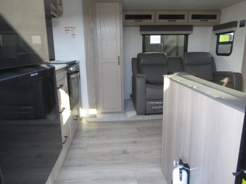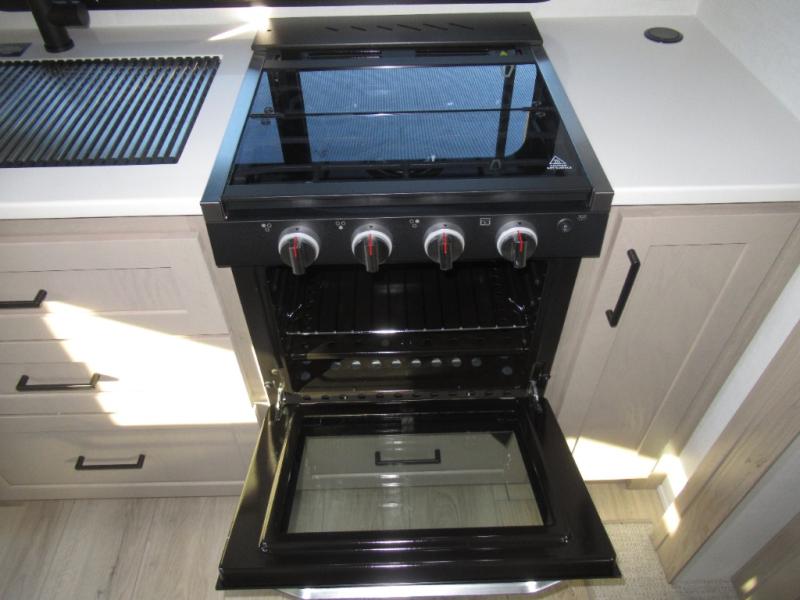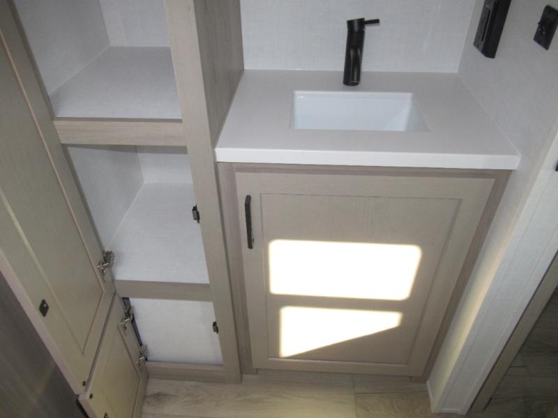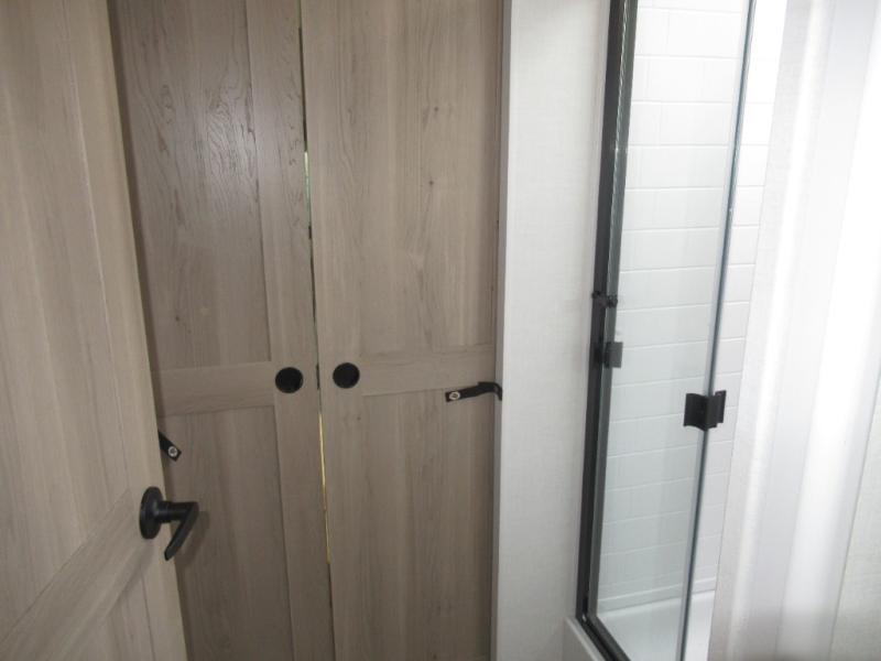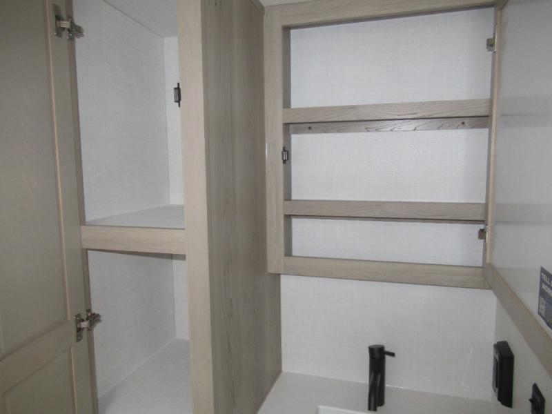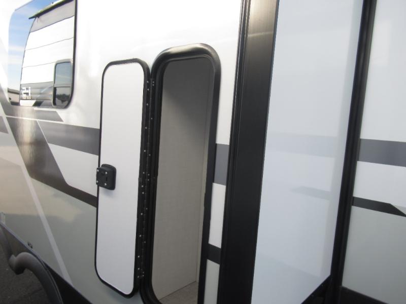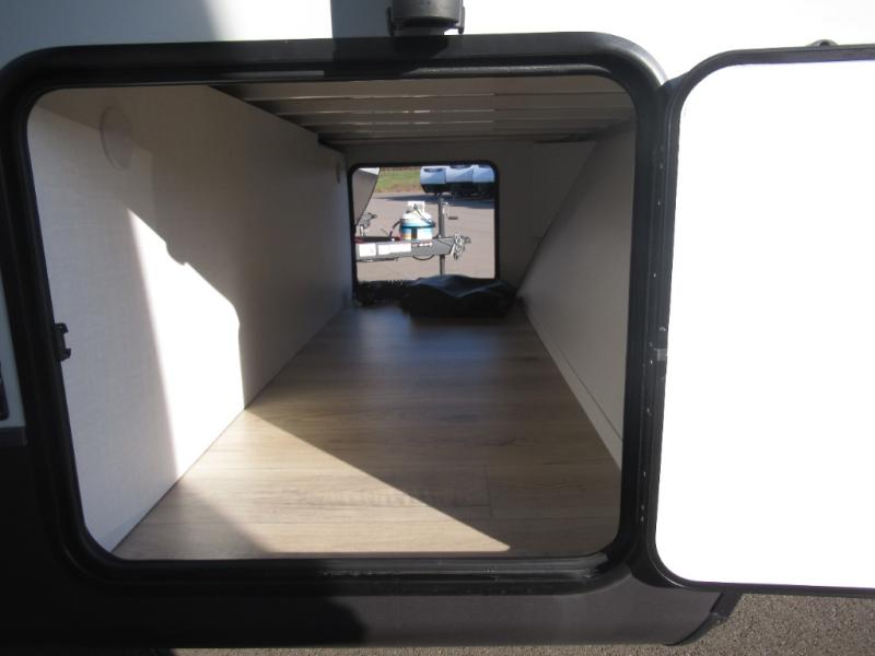 Trips to your favorite campground are made complete with this dual slide out, dual entry trailer! One entry goes straight into the front master bedroom where you'll find an RV queen bed with flip-up storage, a wardrobe slide out, and easy access into the walk-through bath. Once you're through the bath, you'll find the main living area, rear kitchen, and the second entry door at the back. Your crew can play a game at the 39" booth dinette or relax on the theater seat across from the TV. The kitchen includes everything you need to prepare meals in the morning, including a three burner cooktop and microwave oven, plus a 12V refrigerator and a pantry for food storage.