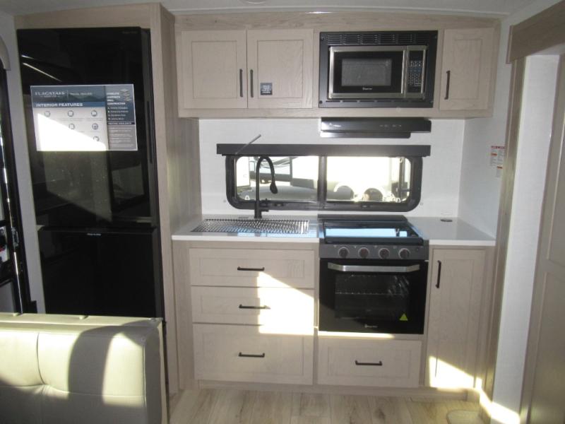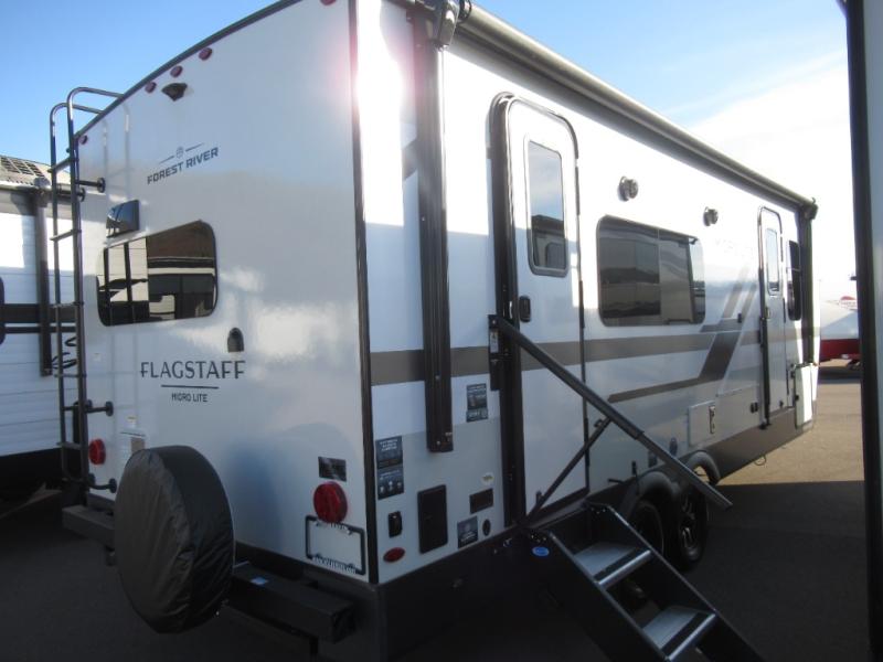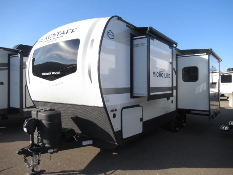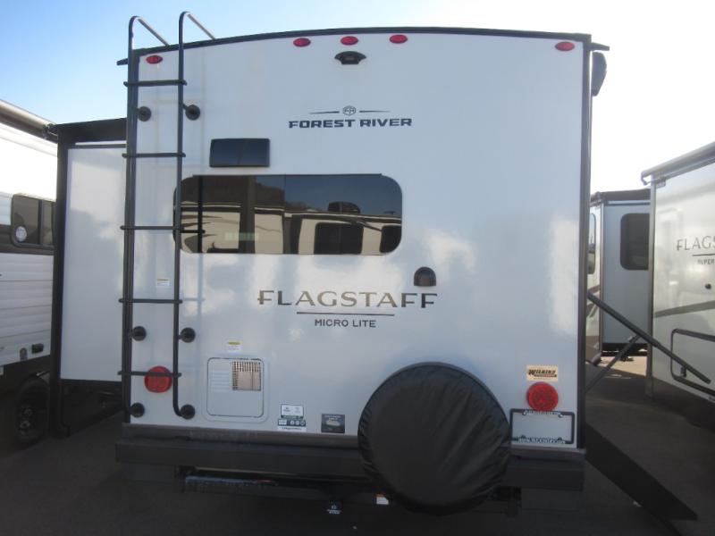With any Flagstaff Micro Lite travel trailer by Forest River you will enjoy lightweight towing, durable construction, and added interior comforts to make each trip memorable! Each model features RoadTech tire pressure monitoring, Dexter Torflex axles, and nitrogen-filled Goodyear endurance tires for smooth towing from home to campground. The 6-sided aluminum framed construction provides a strong foundation so you can enjoy your RV for years to come, plus the radiant foil in the front cap, underbelly and slides help insulate your trailer. Additional exterior features include a 200W solar panel, back-up camera prep, frameless windows, and slam baggage doors. Each model includes the Great Expectations Package with roller shades, solid surface kitchen countertops, and hidden hinge cabinet doors. There is also an exterior hot/cold water port, outside speakers, a power tongue jack and stabilizer jacks, plus many more conveniences.