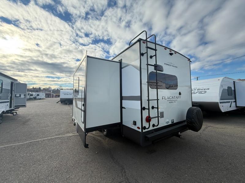 With any Flagstaff Micro Lite travel trailer by Forest River you will enjoy lightweight towing, durable construction, and added interior comforts to make each trip memorable! Each model features RoadTech tire pressure monitoring, Dexter Torflex axles, and nitrogen-filled Goodyear endurance tires for smooth towing from home to campground. The 6-sided aluminum framed construction provides a strong foundation so you can enjoy your RV for years to come, plus the radiant foil in the front cap, underbelly and slides help insulate your trailer. Additional exterior features include a 200W solar panel, back-up camera prep, frameless windows, and slam baggage doors. Each model includes the Great Expectations Package with roller shades, solid surface kitchen countertops, and hidden hinge cabinet doors. There is also an exterior hot/cold water port, outside speakers, a power tongue jack and stabilizer jacks, plus many more conveniences.