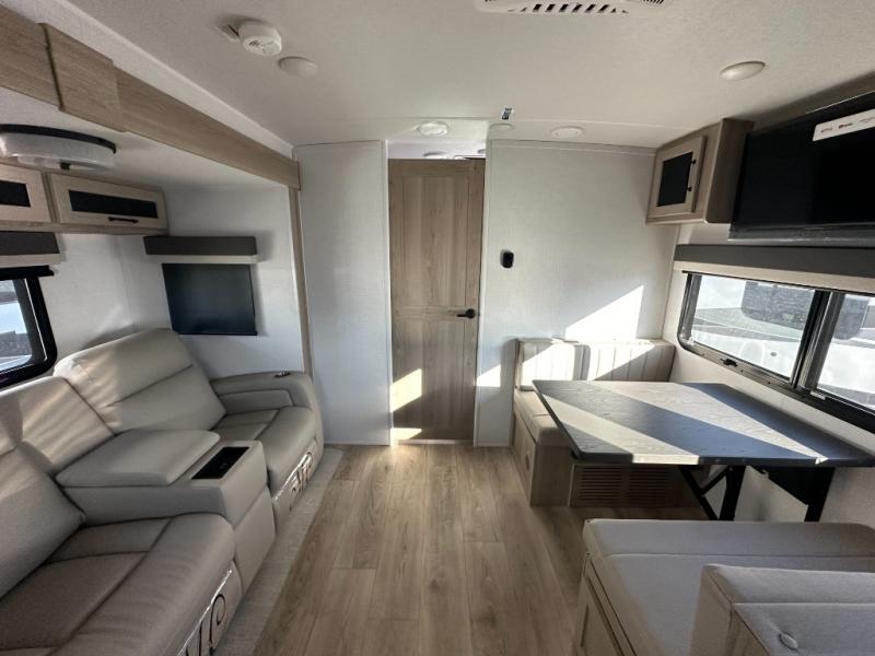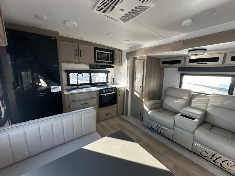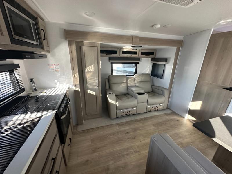 Trips to your favorite campground are made complete with this dual slide out, dual entry trailer! One entry goes straight into the front master bedroom where you'll find an RV queen bed with flip-up storage, a wardrobe slide out, and easy access into the walk-through bath. Once you're through the bath, you'll find the main living area, rear kitchen, and the second entry door at the back. Your crew can play a game at the 39" booth dinette or relax on the theater seat across from the TV. The kitchen includes everything you need to prepare meals in the morning, including a three burner cooktop and microwave oven, plus a 12V refrigerator and a pantry for food storage.