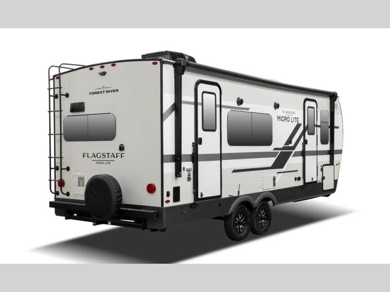 With any Flagstaff Micro Lite travel trailer by Forest River you will enjoy lightweight towing, durable construction, and added interior comforts to make each trip memorable! Each model features RoadTech tire pressure monitoring, Dexter Torflex axles, and nitrogen-filled Goodyear endurance tires for smooth towing from home to campground. The 6-sided aluminum framed construction provides a strong foundation so you can enjoy your RV for years to come, plus the radiant foil in the front cap, underbelly and slides help insulate your trailer. Additional exterior features include a 200W solar panel, back-up camera prep, frameless windows, and slam baggage doors. Each model includes the Great Expectations Package with roller shades, solid surface kitchen countertops, and hidden hinge cabinet doors. There is also an exterior hot/cold water port, outside speakers, a power tongue jack and stabilizer jacks, plus many more conveniences.