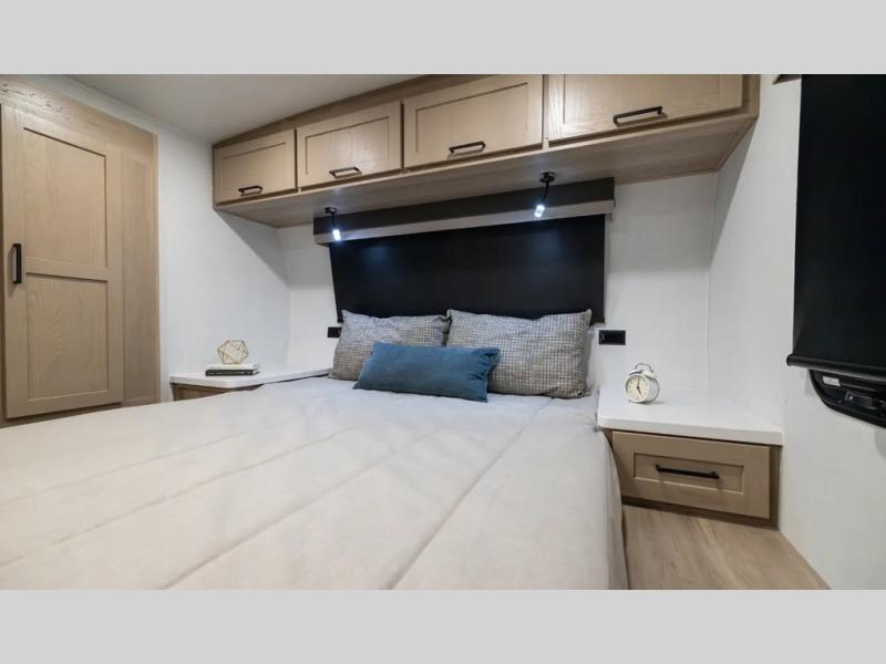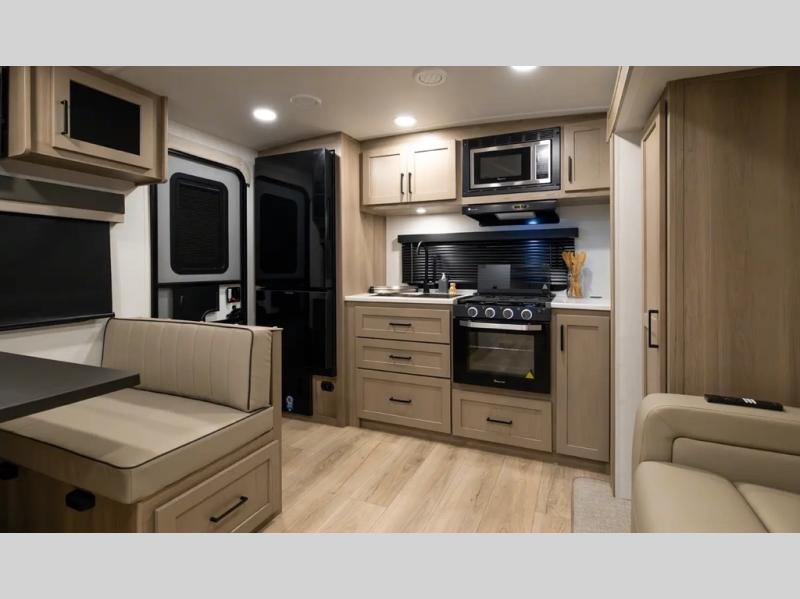 Trips to your favorite campground are made complete with this dual slide out, dual entry trailer! One entry goes straight into the front master bedroom where you'll find an RV queen bed with flip-up storage, a wardrobe slide out, and easy access into the walk-through bath. Once you're through the bath, you'll find the main living area, rear kitchen, and the second entry door at the back. Your crew can play a game at the 39" booth dinette or relax on the theater seat across from the TV. The kitchen includes everything you need to prepare meals in the morning, including a three burner cooktop and microwave oven, plus a 12V refrigerator and a pantry for food storage.