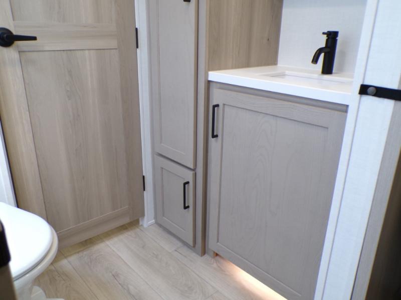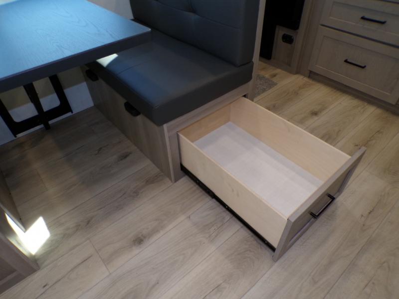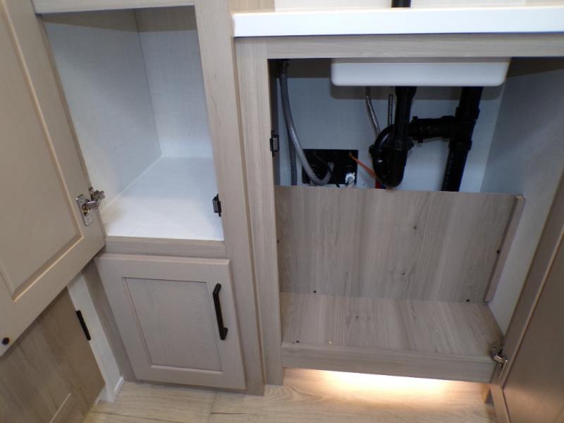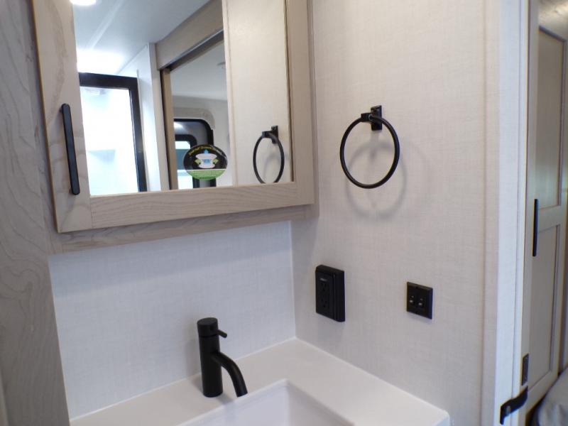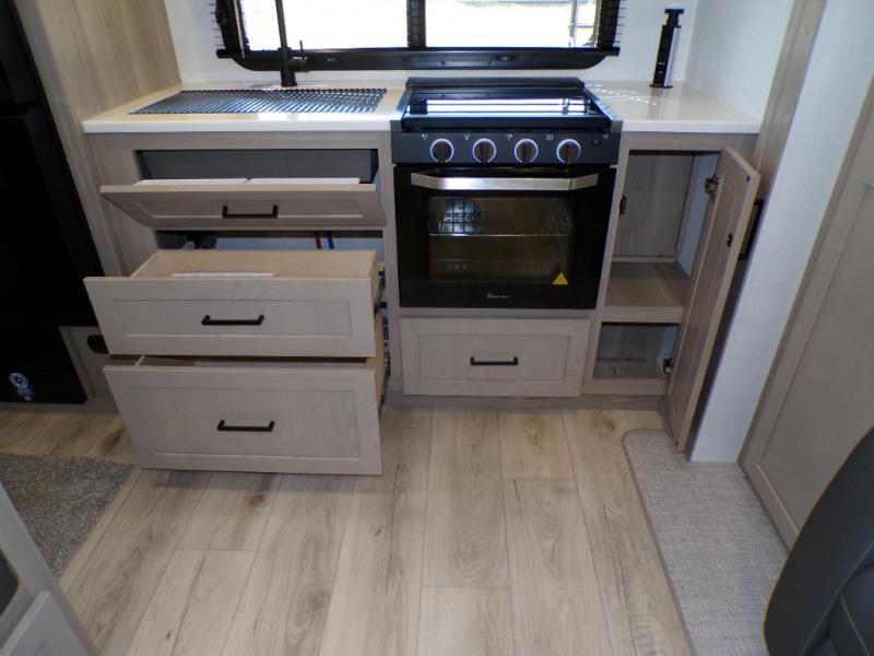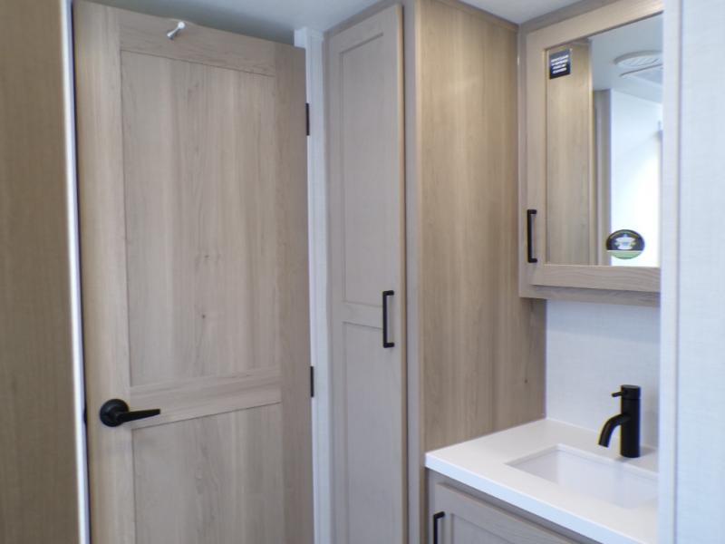 Trips to your favorite campground are made complete with this dual slide out, dual entry trailer! One entry goes straight into the front master bedroom where you'll find an RV queen bed with flip-up storage, a wardrobe slide out, and easy access into the walk-through bath. Once you're through the bath, you'll find the main living area, rear kitchen, and the second entry door at the back. Your crew can play a game at the 39" booth dinette or relax on the theater seat across from the TV. The kitchen includes everything you need to prepare meals in the morning, including a three burner cooktop and microwave oven, plus a 12V refrigerator and a pantry for food storage.