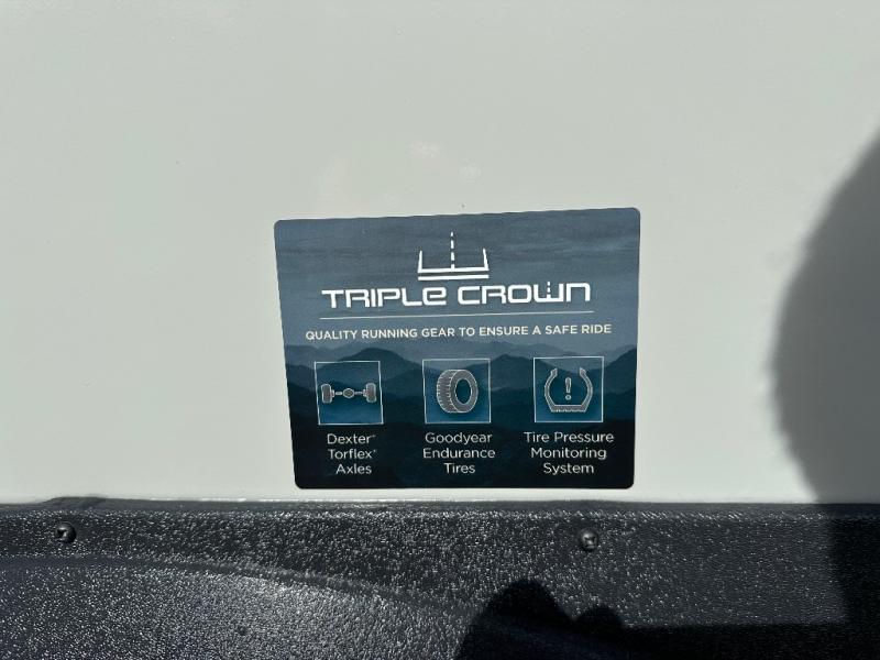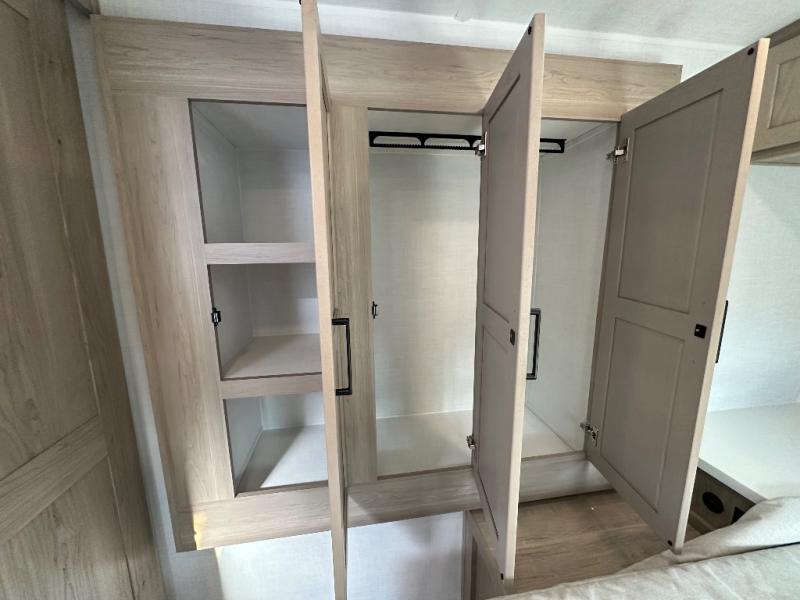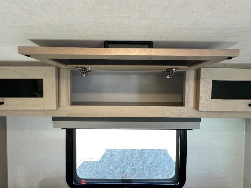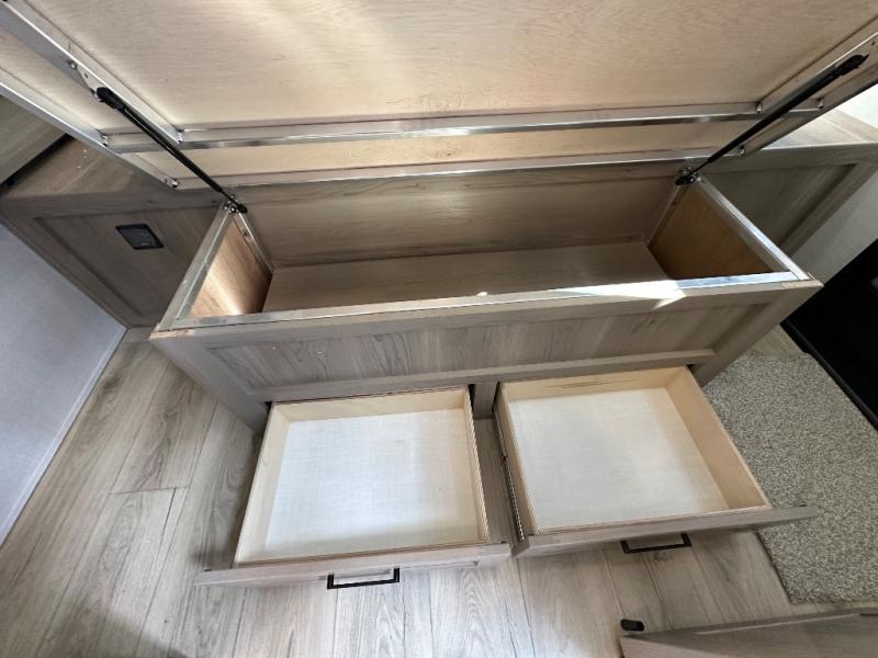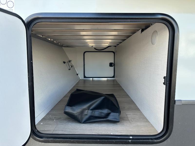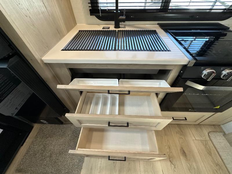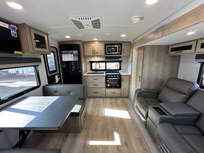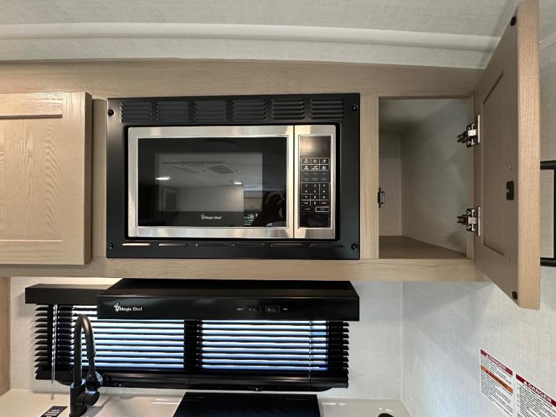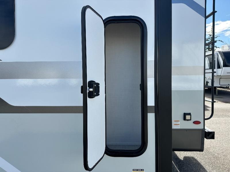 Trips to your favorite campground are made complete with this dual slide out, dual entry trailer! One entry goes straight into the front master bedroom where you'll find an RV queen bed with flip-up storage, a wardrobe slide out, and easy access into the walk-through bath. Once you're through the bath, you'll find the main living area, rear kitchen, and the second entry door at the back. Your crew can play a game at the 39" booth dinette or relax on the theater seat across from the TV. The kitchen includes everything you need to prepare meals in the morning, including a three burner cooktop and microwave oven, plus a 12V refrigerator and a pantry for food storage.
