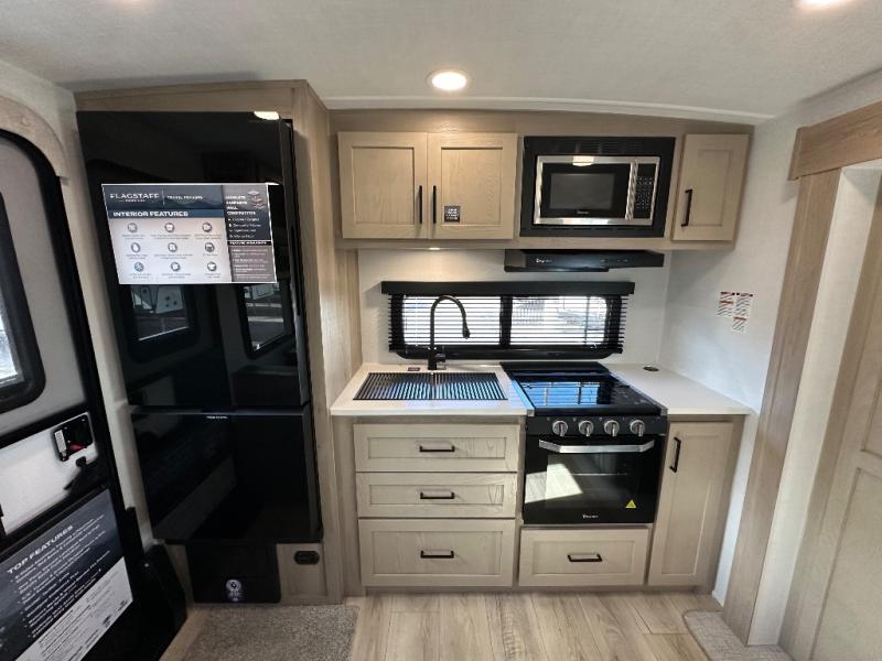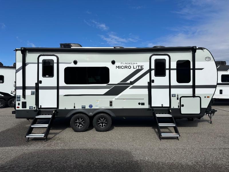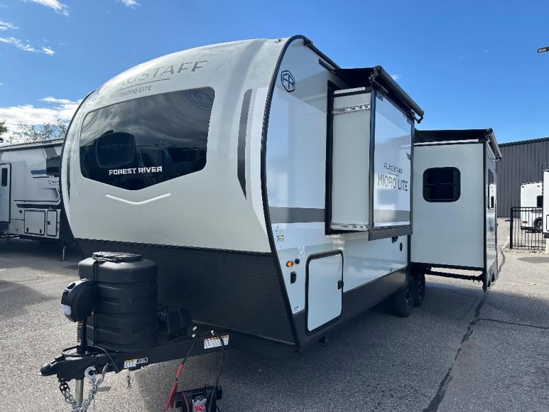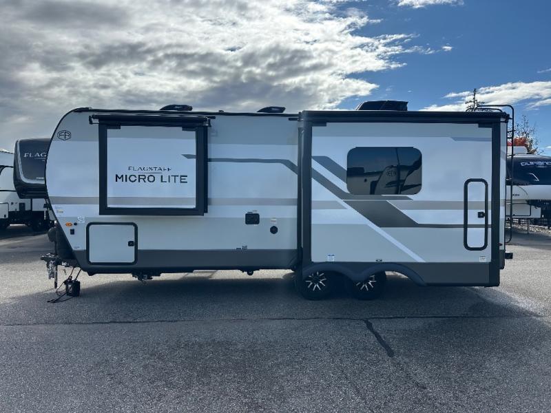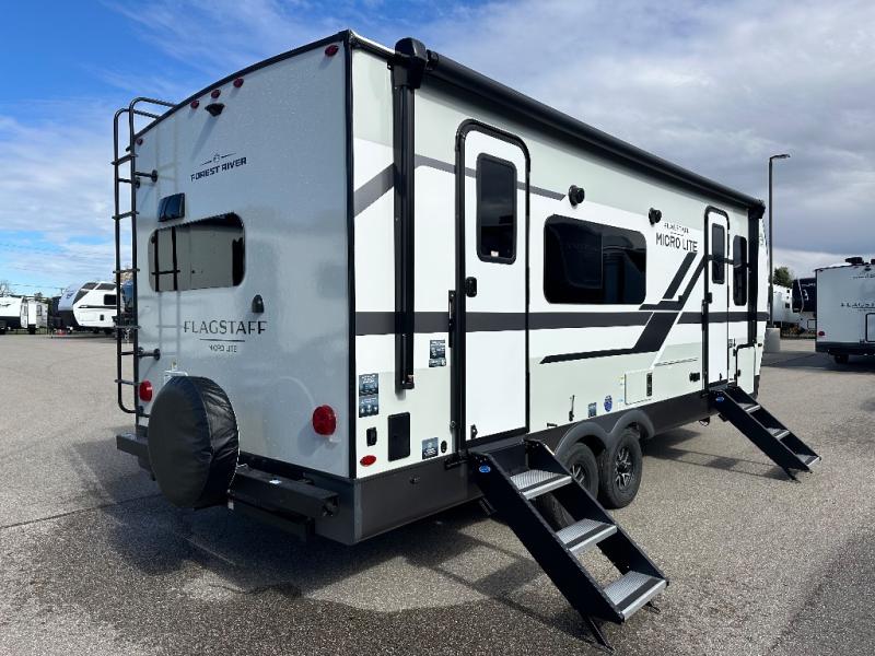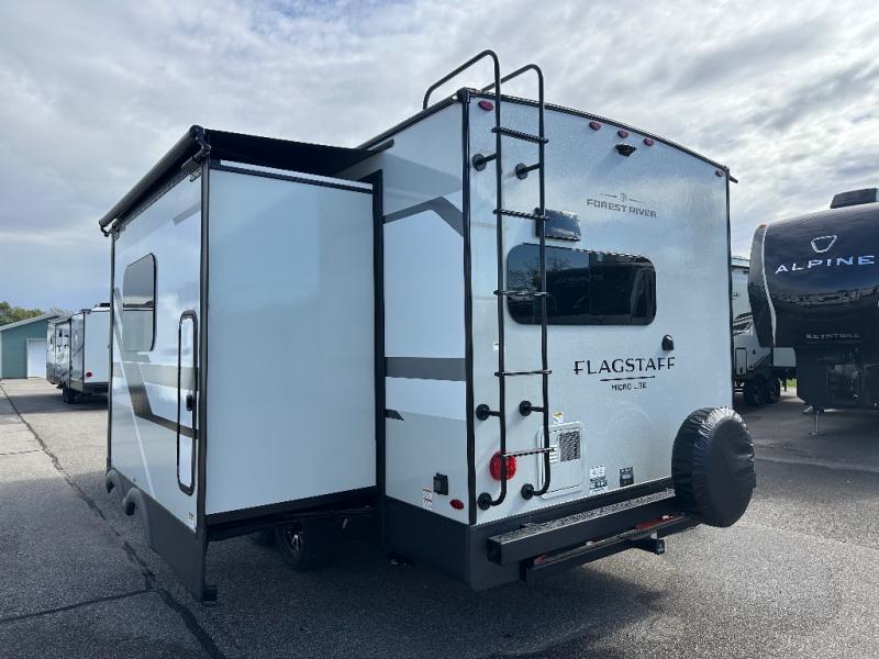 With any Flagstaff Micro Lite travel trailer by Forest River you will enjoy lightweight towing, durable construction, and added interior comforts to make each trip memorable! Each model features RoadTech tire pressure monitoring, Dexter Torflex axles, and nitrogen-filled Goodyear endurance tires for smooth towing from home to campground. The 6-sided aluminum framed construction provides a strong foundation so you can enjoy your RV for years to come, plus the radiant foil in the front cap, underbelly and slides help insulate your trailer. Additional exterior features include a 200W solar panel, back-up camera prep, frameless windows, and slam baggage doors. Each model includes the Great Expectations Package with roller shades, solid surface kitchen countertops, and hidden hinge cabinet doors. There is also an exterior hot/cold water port, outside speakers, a power tongue jack and stabilizer jacks, plus many more conveniences.