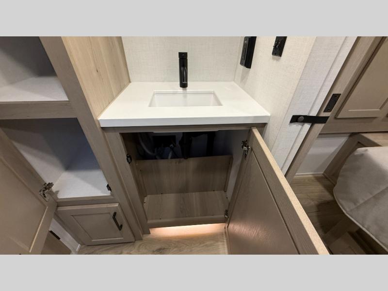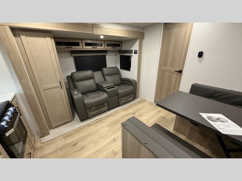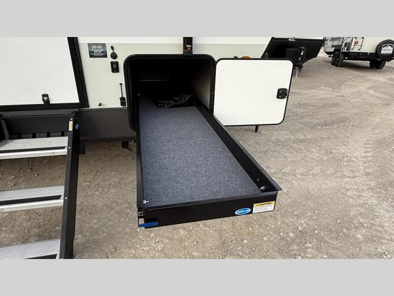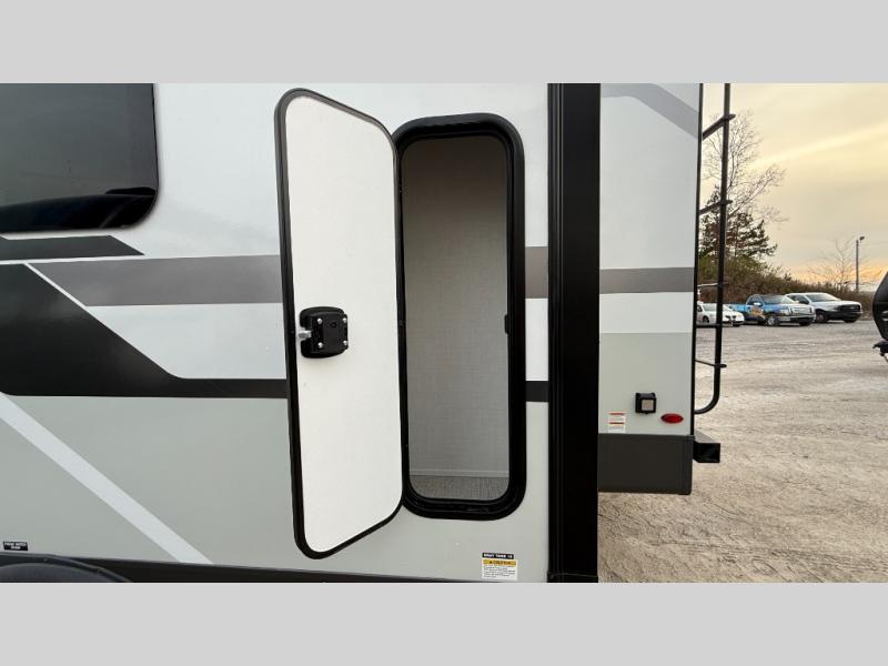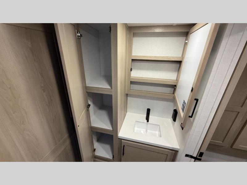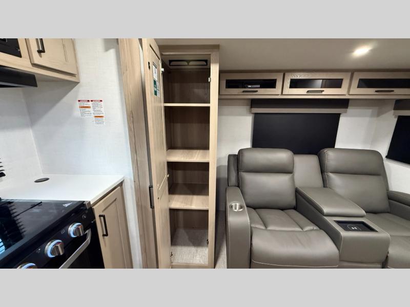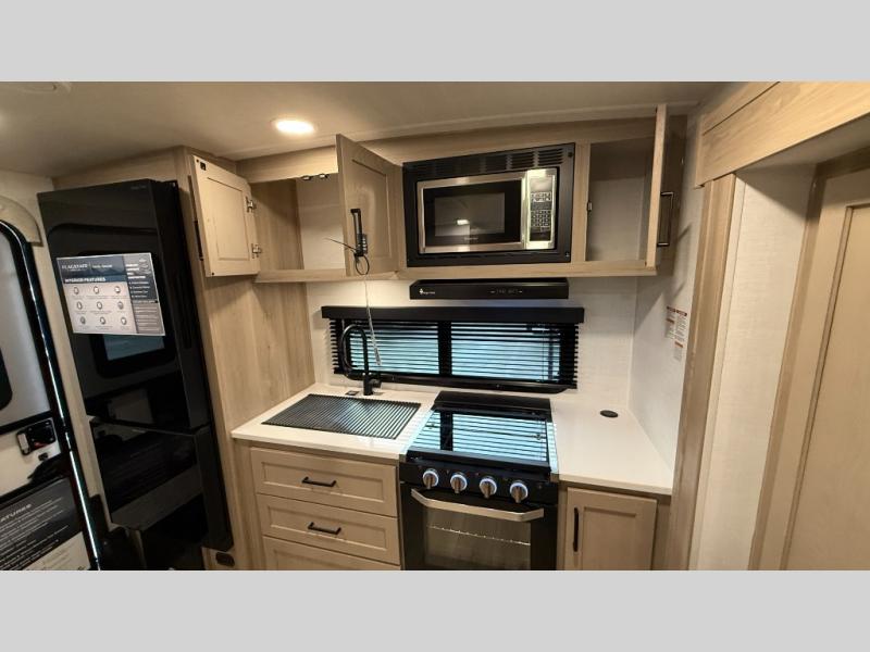 Trips to your favorite campground are made complete with this dual slide out, dual entry trailer! One entry goes straight into the front master bedroom where you'll find an RV queen bed with flip-up storage, a wardrobe slide out, and easy access into the walk-through bath. Once you're through the bath, you'll find the main living area, rear kitchen, and the second entry door at the back. Your crew can play a game at the 39" booth dinette or relax on the theater seat across from the TV. The kitchen includes everything you need to prepare meals in the morning, including a three burner cooktop and microwave oven, plus a 12V refrigerator and a pantry for food storage.