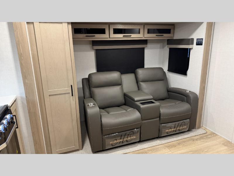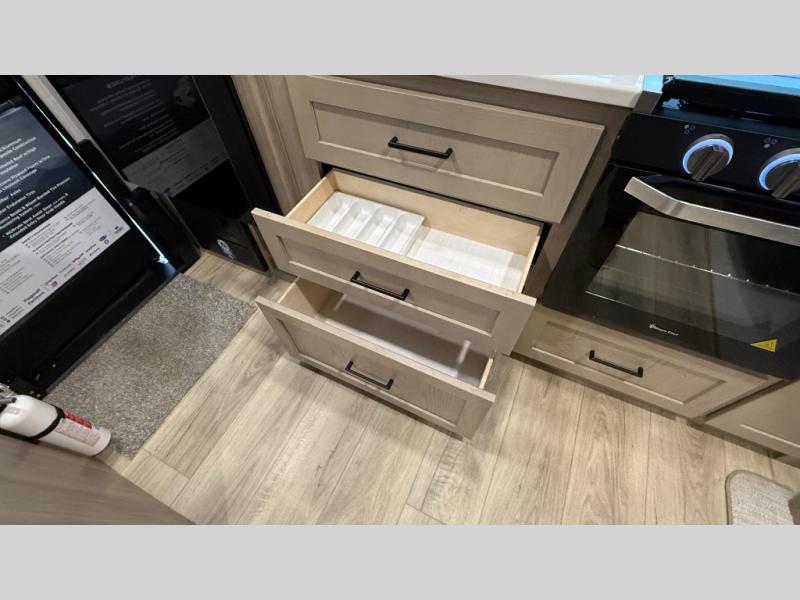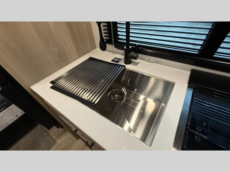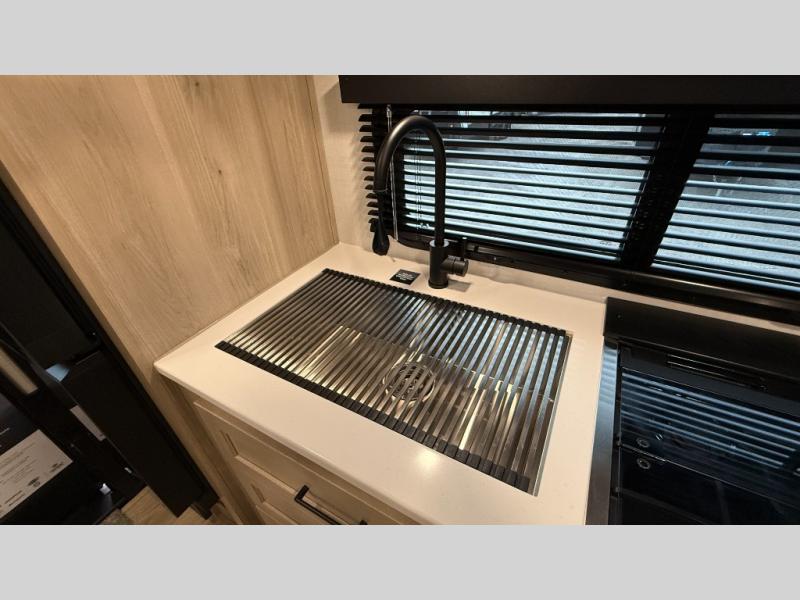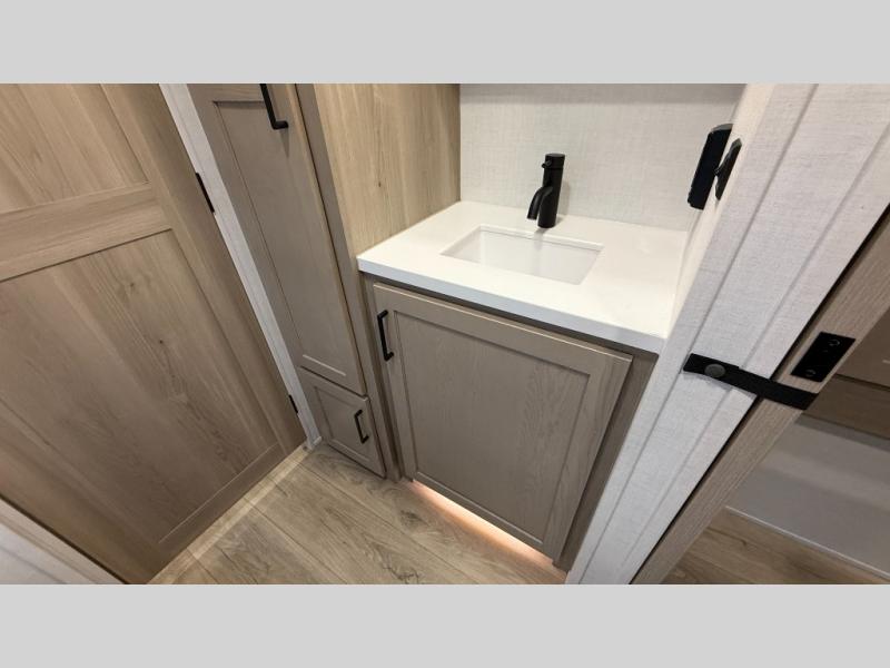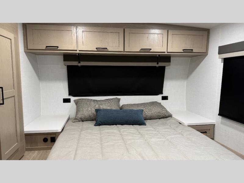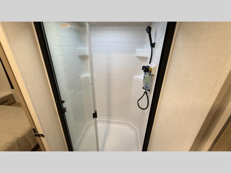 Trips to your favorite campground are made complete with this dual slide out, dual entry trailer! One entry goes straight into the front master bedroom where you'll find an RV queen bed with flip-up storage, a wardrobe slide out, and easy access into the walk-through bath. Once you're through the bath, you'll find the main living area, rear kitchen, and the second entry door at the back. Your crew can play a game at the 39" booth dinette or relax on the theater seat across from the TV. The kitchen includes everything you need to prepare meals in the morning, including a three burner cooktop and microwave oven, plus a 12V refrigerator and a pantry for food storage.
