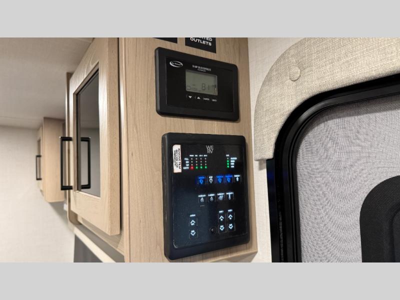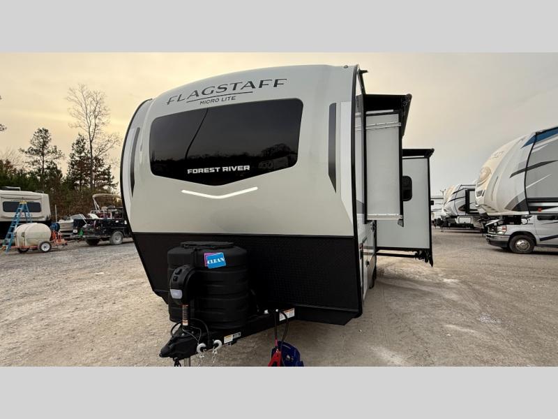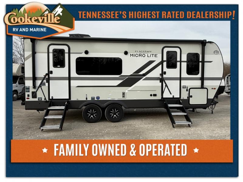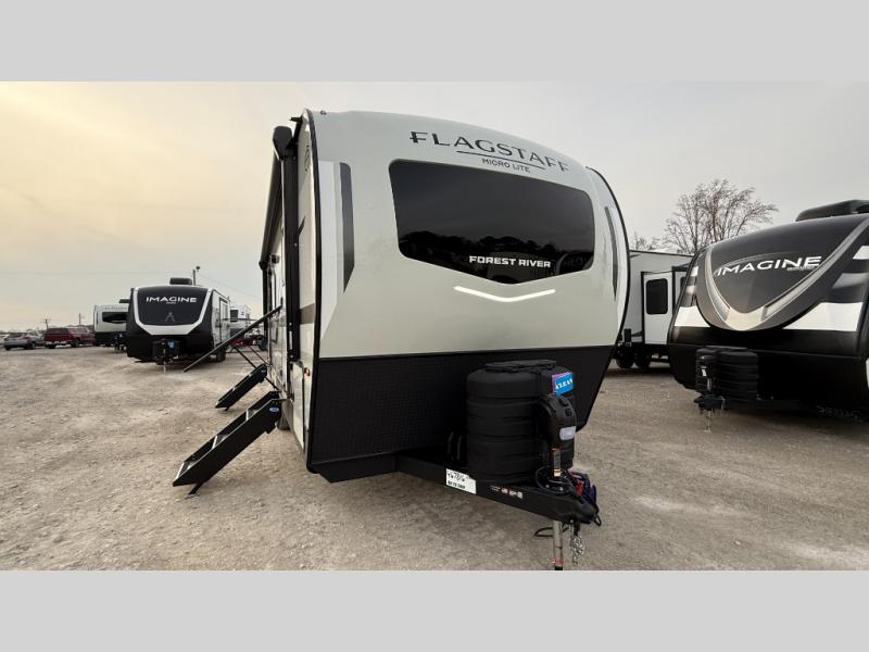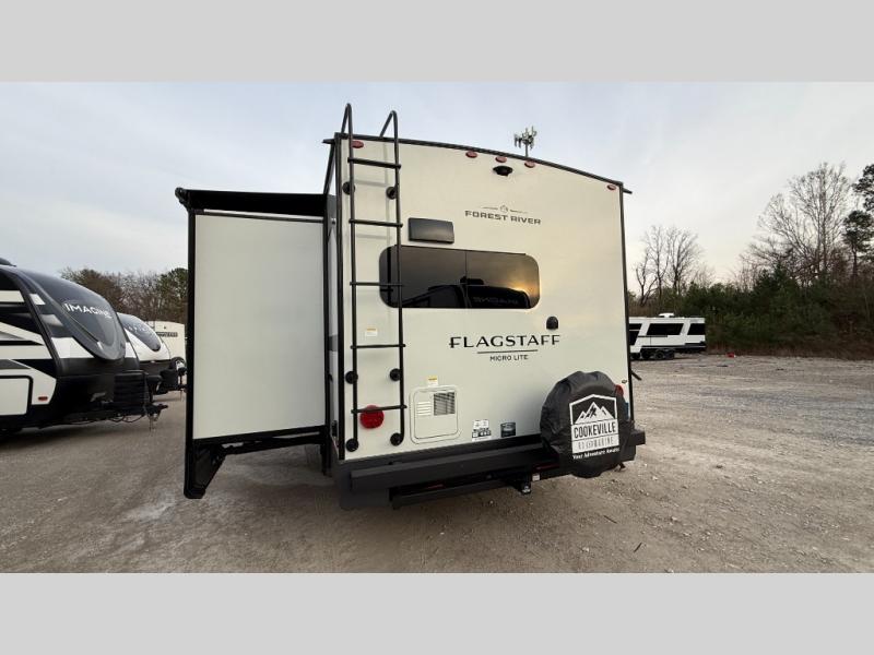 With any Flagstaff Micro Lite travel trailer by Forest River you will enjoy lightweight towing, durable construction, and added interior comforts to make each trip memorable! Each model features RoadTech tire pressure monitoring, Dexter Torflex axles, and nitrogen-filled Goodyear endurance tires for smooth towing from home to campground. The 6-sided aluminum framed construction provides a strong foundation so you can enjoy your RV for years to come, plus the radiant foil in the front cap, underbelly and slides help insulate your trailer. Additional exterior features include a 200W solar panel, back-up camera prep, frameless windows, and slam baggage doors. Each model includes the Great Expectations Package with roller shades, solid surface kitchen countertops, and hidden hinge cabinet doors. There is also an exterior hot/cold water port, outside speakers, a power tongue jack and stabilizer jacks, plus many more conveniences.