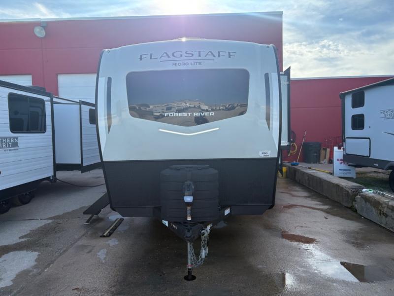 With any Flagstaff Micro Lite travel trailer by Forest River you will enjoy lightweight towing, durable construction, and added interior comforts to make each trip memorable! Each model features RoadTech tire pressure monitoring, Dexter Torflex axles, and nitrogen-filled Goodyear endurance tires for smooth towing from home to campground. The 6-sided aluminum framed construction provides a strong foundation so you can enjoy your RV for years to come, plus the radiant foil in the front cap, underbelly and slides help insulate your trailer. Additional exterior features include a 200W solar panel, back-up camera prep, frameless windows, and slam baggage doors. Each model includes the Great Expectations Package with roller shades, solid surface kitchen countertops, and hidden hinge cabinet doors. There is also an exterior hot/cold water port, outside speakers, a power tongue jack and stabilizer jacks, plus many more conveniences.