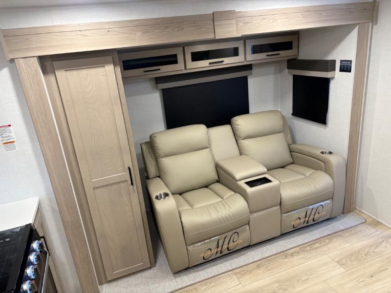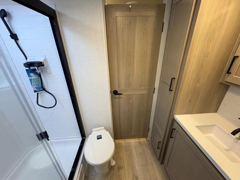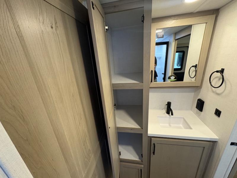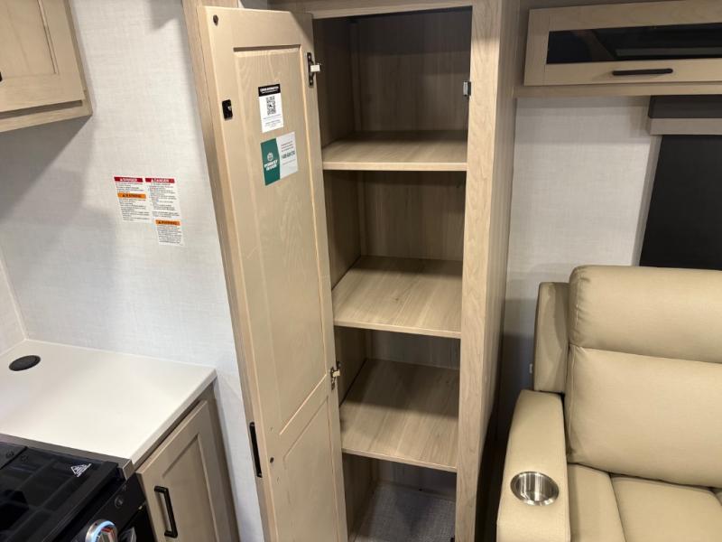Trips to your favorite campground are made complete with this dual slide out, dual entry trailer! One entry goes straight into the front master bedroom where you'll find an RV queen bed with flip-up storage, a wardrobe slide out, and easy access into the walk-through bath. Once you're through the bath, you'll find the main living area, rear kitchen, and the second entry door at the back. Your crew can play a game at the 39" booth dinette or relax on the theater seat across from the TV. The kitchen includes everything you need to prepare meals in the morning, including a three burner cooktop and microwave oven, plus a 12V refrigerator and a pantry for food storage.