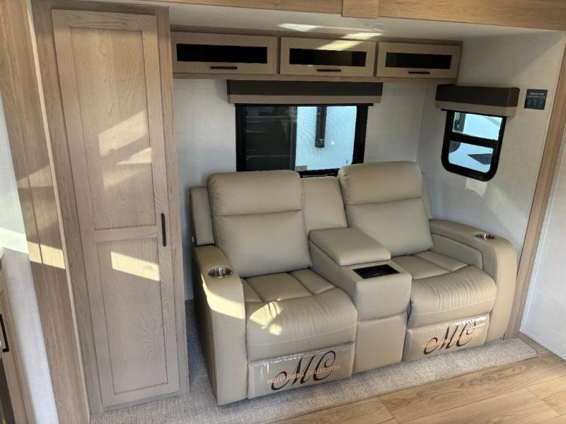Trips to your favorite campground are made complete with this dual slide out, dual entry trailer! One entry goes straight into the front master bedroom where you'll find an RV queen bed with flip-up storage, a wardrobe slide out, and easy access into the walk-through bath. Once you're through the bath, you'll find the main living area, rear kitchen, and the second entry door at the back. Your crew can play a game at the 39" booth dinette or relax on the theater seat across from the TV. The kitchen includes everything you need to prepare meals in the morning, including a three burner cooktop and microwave oven, plus a 12V refrigerator and a pantry for food storage.