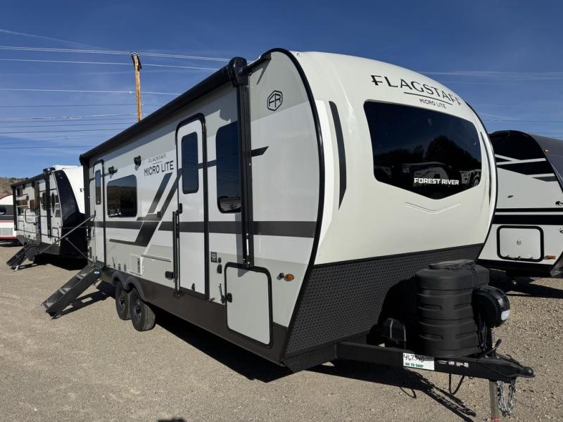 With any Flagstaff Micro Lite travel trailer by Forest River you will enjoy lightweight towing, durable construction, and added interior comforts to make each trip memorable! Each model features RoadTech tire pressure monitoring, Dexter Torflex axles, and nitrogen-filled Goodyear endurance tires for smooth towing from home to campground. The 6-sided aluminum framed construction provides a strong foundation so you can enjoy your RV for years to come, plus the radiant foil in the front cap, underbelly and slides help insulate your trailer. Additional exterior features include a 200W solar panel, back-up camera prep, frameless windows, and slam baggage doors. Each model includes the Great Expectations Package with roller shades, solid surface kitchen countertops, and hidden hinge cabinet doors. There is also an exterior hot/cold water port, outside speakers, a power tongue jack and stabilizer jacks, plus many more conveniences.