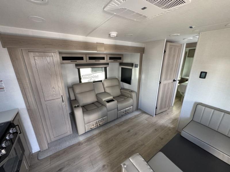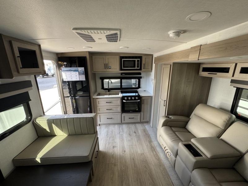 Trips to your favorite campground are made complete with this dual slide out, dual entry trailer! One entry goes straight into the front master bedroom where you'll find an RV queen bed with flip-up storage, a wardrobe slide out, and easy access into the walk-through bath. Once you're through the bath, you'll find the main living area, rear kitchen, and the second entry door at the back. Your crew can play a game at the 39" booth dinette or relax on the theater seat across from the TV. The kitchen includes everything you need to prepare meals in the morning, including a three burner cooktop and microwave oven, plus a 12V refrigerator and a pantry for food storage.