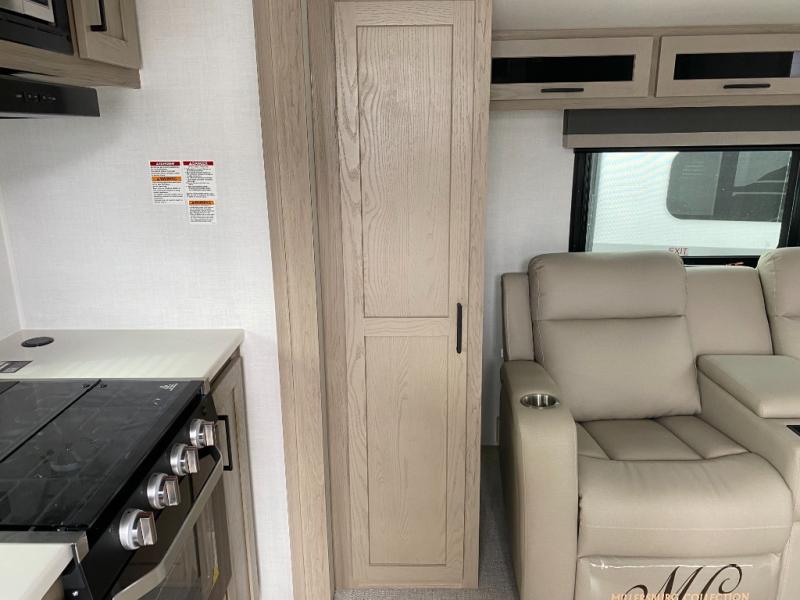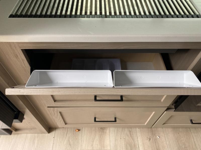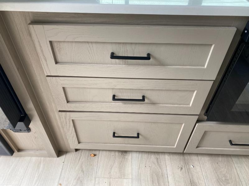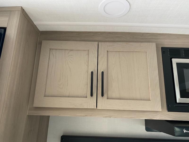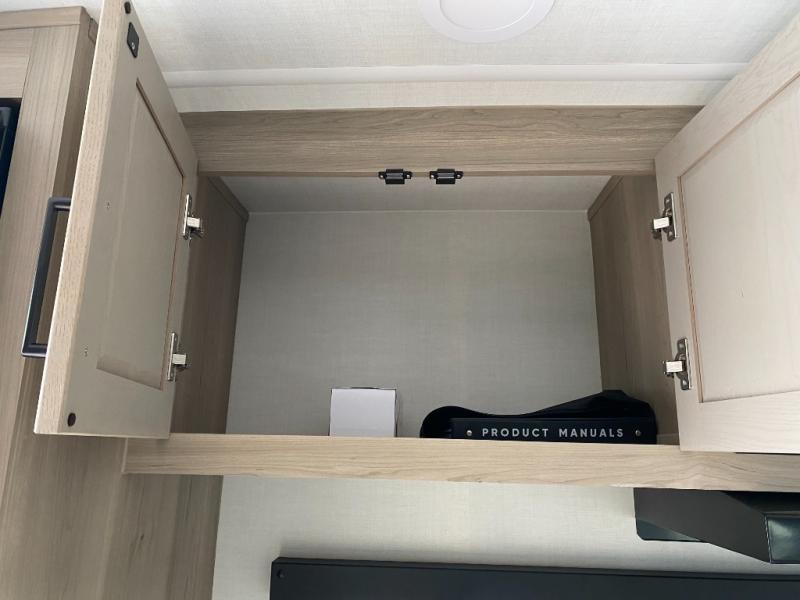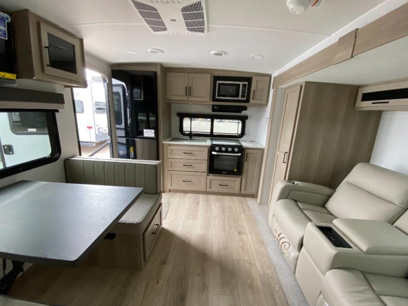 Trips to your favorite campground are made complete with this dual slide out, dual entry trailer! One entry goes straight into the front master bedroom where you'll find an RV queen bed with flip-up storage, a wardrobe slide out, and easy access into the walk-through bath. Once you're through the bath, you'll find the main living area, rear kitchen, and the second entry door at the back. Your crew can play a game at the 39" booth dinette or relax on the theater seat across from the TV. The kitchen includes everything you need to prepare meals in the morning, including a three burner cooktop and microwave oven, plus a 12V refrigerator and a pantry for food storage.