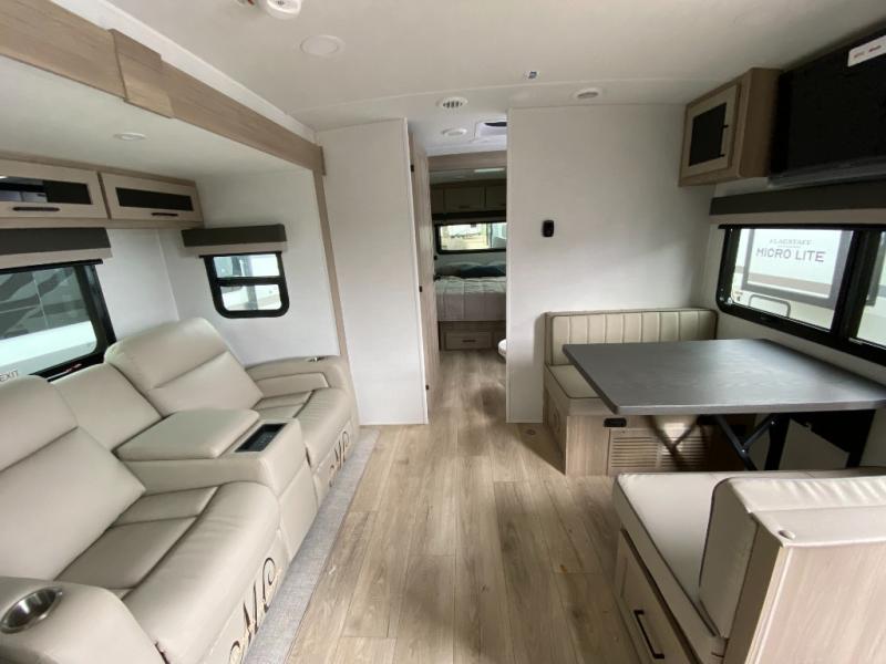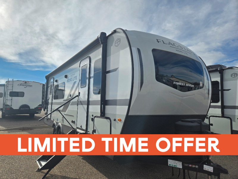 With any Flagstaff Micro Lite travel trailer by Forest River you will enjoy lightweight towing, durable construction, and added interior comforts to make each trip memorable! Each model features RoadTech tire pressure monitoring, Dexter Torflex axles, and nitrogen-filled Goodyear endurance tires for smooth towing from home to campground. The 6-sided aluminum framed construction provides a strong foundation so you can enjoy your RV for years to come, plus the radiant foil in the front cap, underbelly and slides help insulate your trailer. Additional exterior features include a 200W solar panel, back-up camera prep, frameless windows, and slam baggage doors. Each model includes the Great Expectations Package with roller shades, solid surface kitchen countertops, and hidden hinge cabinet doors. There is also an exterior hot/cold water port, outside speakers, a power tongue jack and stabilizer jacks, plus many more conveniences.