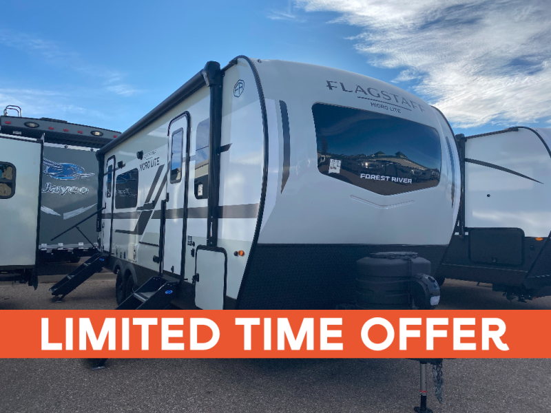 With any Flagstaff Micro Lite travel trailer by Forest River you will enjoy lightweight towing, durable construction, and added interior comforts to make each trip memorable! Each model features RoadTech tire pressure monitoring, Dexter Torflex axles, and nitrogen-filled Goodyear endurance tires for smooth towing from home to campground. The 6-sided aluminum framed construction provides a strong foundation so you can enjoy your RV for years to come, plus the radiant foil in the front cap, underbelly and slides help insulate your trailer. Additional exterior features include a 200W solar panel, back-up camera prep, frameless windows, and slam baggage doors. Each model includes the Great Expectations Package with roller shades, solid surface kitchen countertops, and hidden hinge cabinet doors. There is also an exterior hot/cold water port, outside speakers, a power tongue jack and stabilizer jacks, plus many more conveniences.
