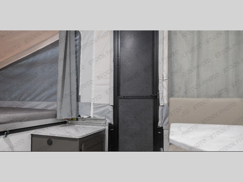 With any Flagstaff OTG (Off The Ground) folding pop-up camper by Forest River, you will enjoy a more simple approach to outdoor fun. If you're a regular tent camper, but are looking for a little more comfort, then take a look at these easy-to-tow models! There are electric brakes, balancing bead filled tires, and leaf spring axles that provide that easy towing, and the alloy fiberglass exterior is sure to be eye-catching. A one-piece screen door also comes standard so you can let fresh air in, while keeping bugs out, and the LED interior lights will be an added benefit you didn't have while tent camping. Each model also includes residential style cabinet doors, wood look flooring, and an Andover Sable wood interior for a more outdoorsy feel!