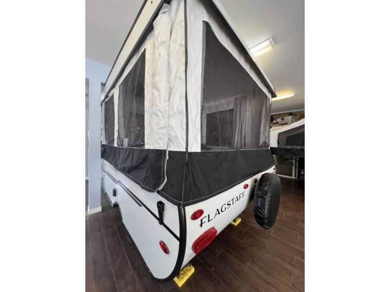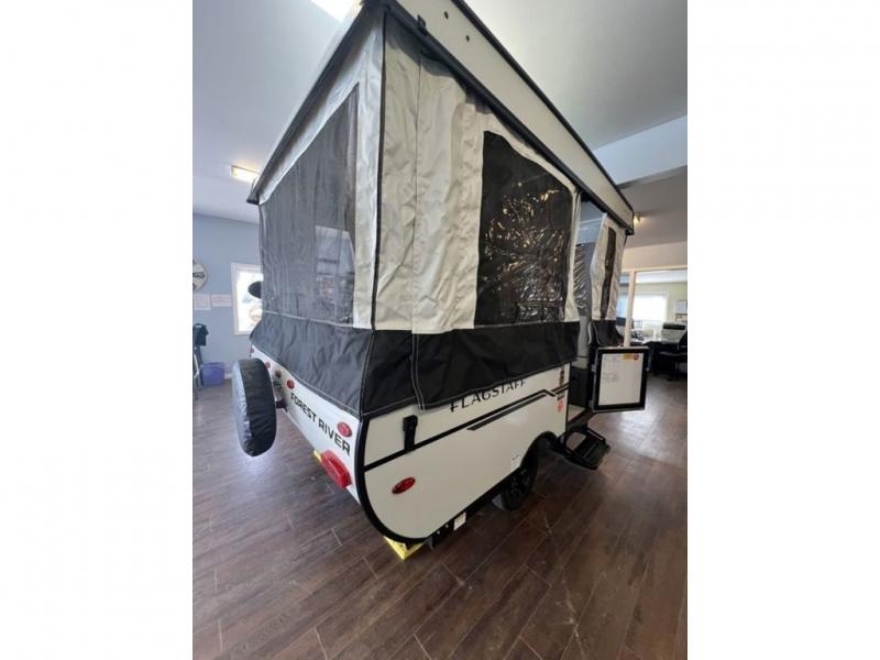 With any Flagstaff OTG (Off The Ground) folding pop-up camper by Forest River, you will enjoy a more simple approach to outdoor fun. If you're a regular tent camper, but are looking for a little more comfort, then take a look at these easy-to-tow models! There are electric brakes, balancing bead filled tires, and leaf spring axles that provide that easy towing, and the alloy fiberglass exterior is sure to be eye-catching. A one-piece screen door also comes standard so you can let fresh air in, while keeping bugs out, and the LED interior lights will be an added benefit you didn't have while tent camping. Each model also includes residential style cabinet doors, wood look flooring, and an Andover Sable wood interior for a more outdoorsy feel!