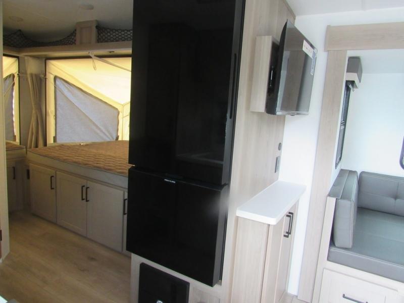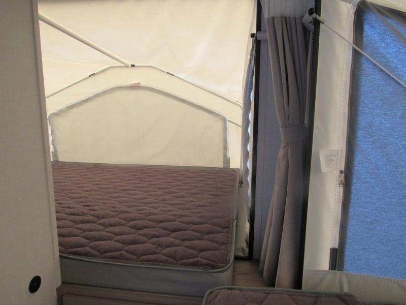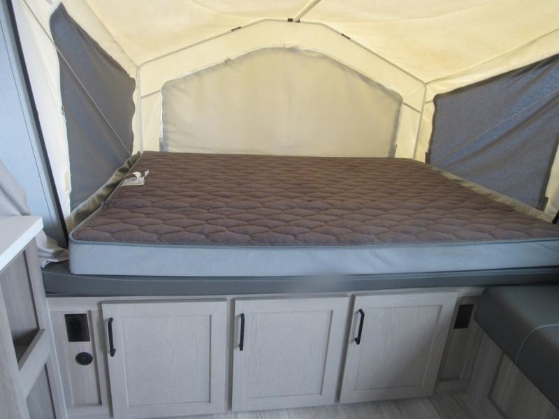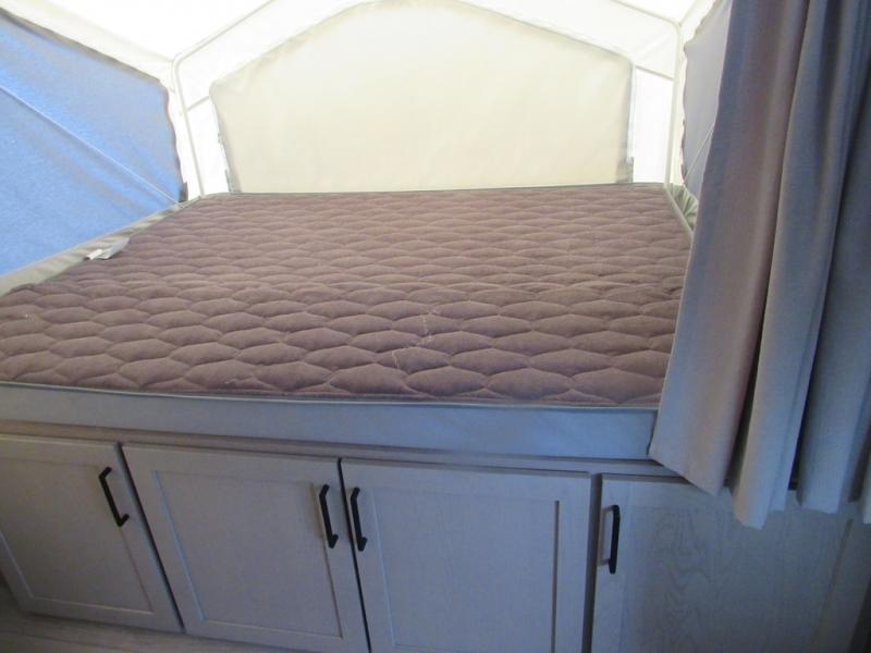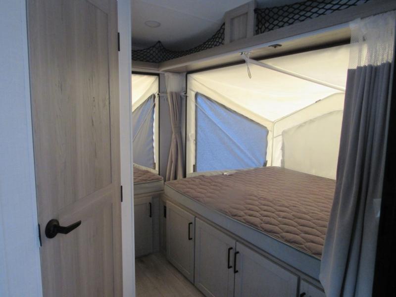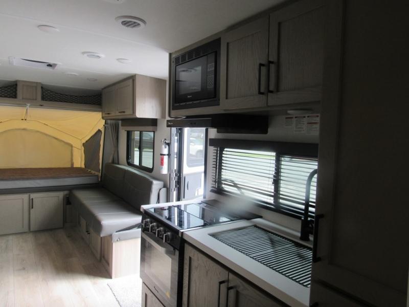 If you're looking for more sleeping space and added interior space, your search is over! This expandable includes three queen tent end beds, plus a U-shaped dinette and a flip sofa to sleep nine! A three burner cooktop and microwave oven in the kitchen will allow you to prepare meals each day, and there is an added exterior griddle for dinner outside. This model also includes an impressive amount of storage, including a kitchen pantry and exterior storage for hiking gear and tackle boxes!
