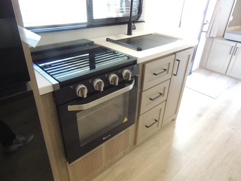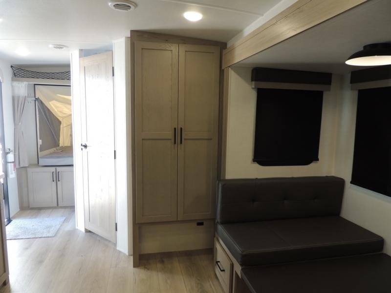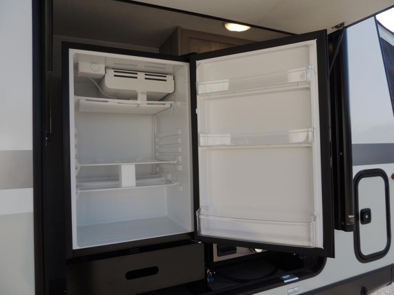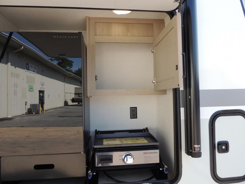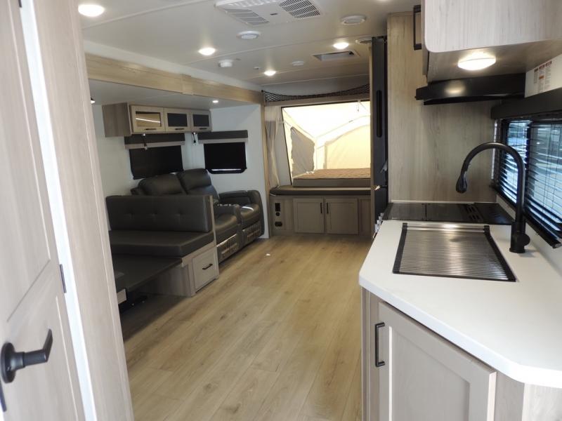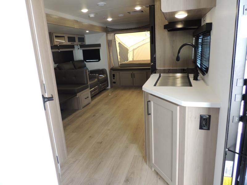 You will feel right at home in this spacious expandable thanks to the large slide out and the fireplace with a TV. Within the slide you'll find a booth dinette and hide-a-bed sofa, or you can choose the optional theater seat in place of the sofa. There is a full kitchen with a three burner cooktop, a 12V refrigerator, plus a microwave oven, and if you enjoy cooking outdoors, you're going to love the outside kitchen! You'll also find an 18' power awning outdoors, along with three exterior storage compartments and Solid Step entry steps.