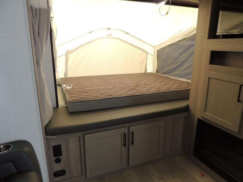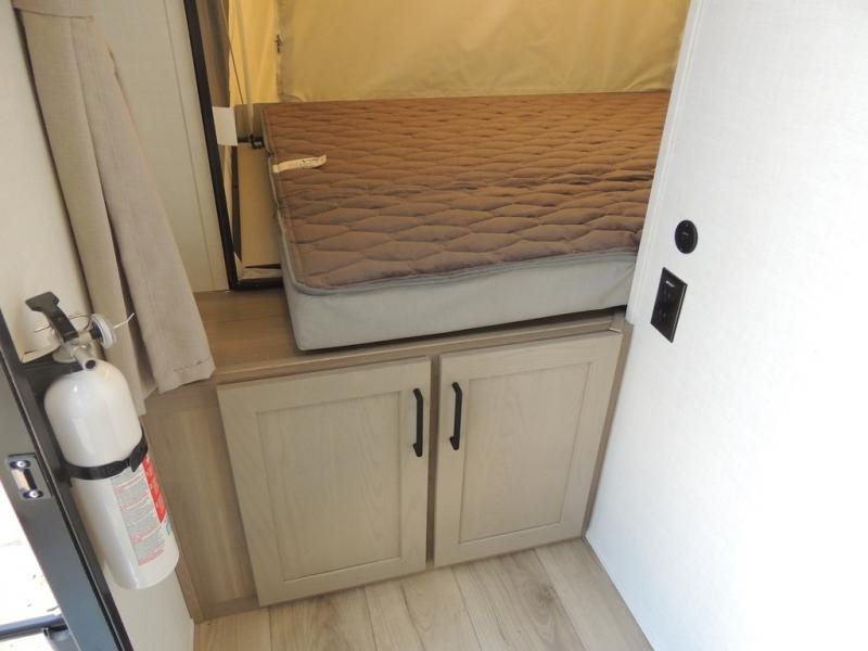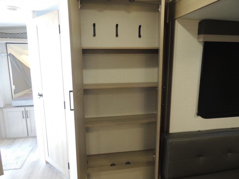 Each Flagstaff Shamrock expandable by Forest River includes an enclosed underbelly, interior and exterior composite sidewall construction, and a vinyl/rubber composite roofing membrane for added durability. The power tongue jack will make hitching up easier than ever, and the torsion axle, Rubber-Ryde suspension and Goodyear Endurance tires will provide smooth towing. You will also appreciate having a 200W roof solar panel with a 1800W inverter, an outside spray port, Keyed-Alike locks, plus many more exterior conveniences. The interior is made to feel more like home with solid wood cabinet doors and drawers, marine grade carpet in the slides, Sedona Wood cabinetry, plus seamless kitchen countertops.