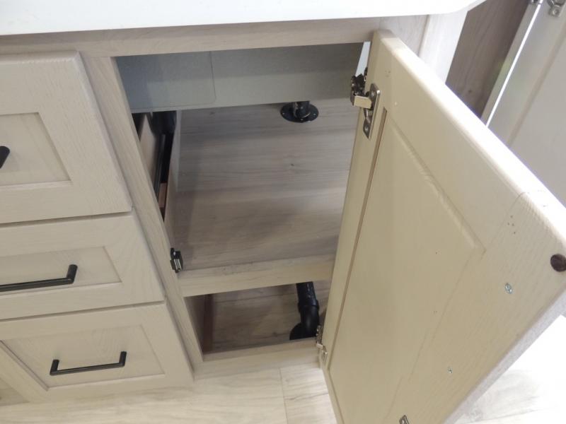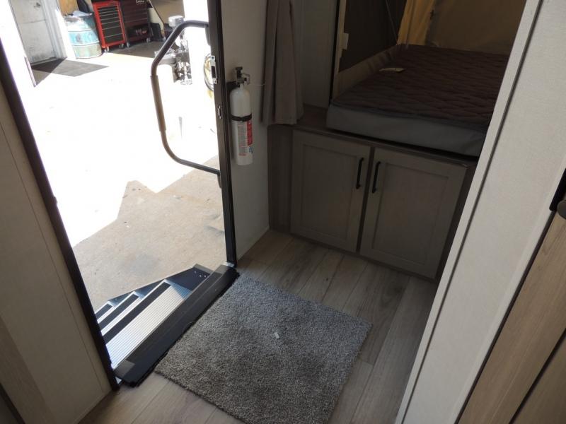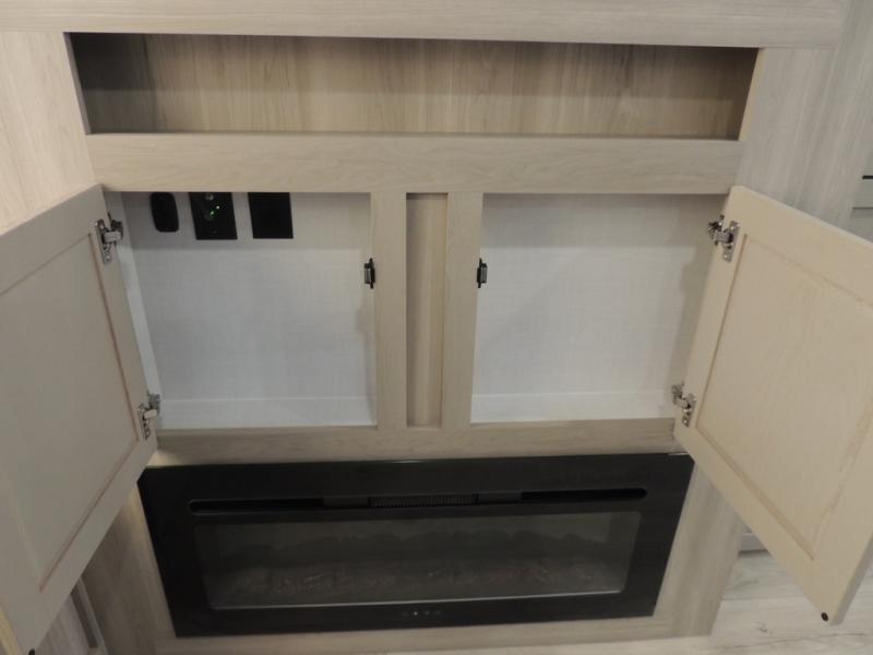 You will feel right at home in this spacious expandable thanks to the large slide out and the fireplace with a TV. Within the slide you'll find a booth dinette and hide-a-bed sofa, or you can choose the optional theater seat in place of the sofa. There is a full kitchen with a three burner cooktop, a 12V refrigerator, plus a microwave oven, and if you enjoy cooking outdoors, you're going to love the outside kitchen! You'll also find an 18' power awning outdoors, along with three exterior storage compartments and Solid Step entry steps.