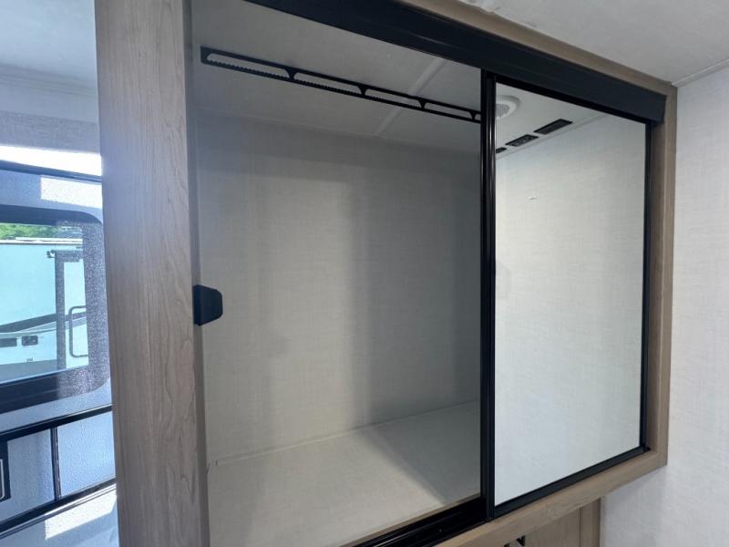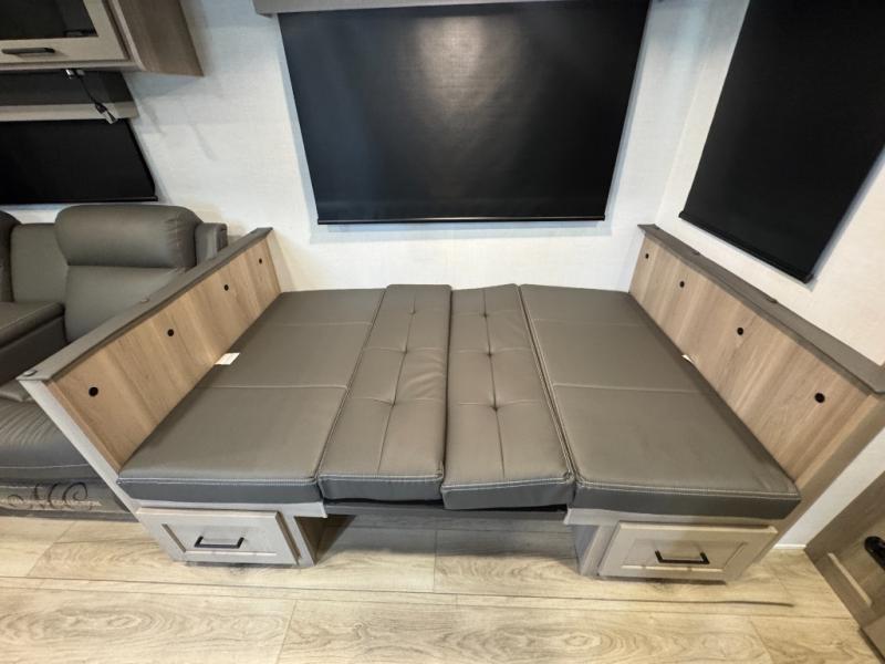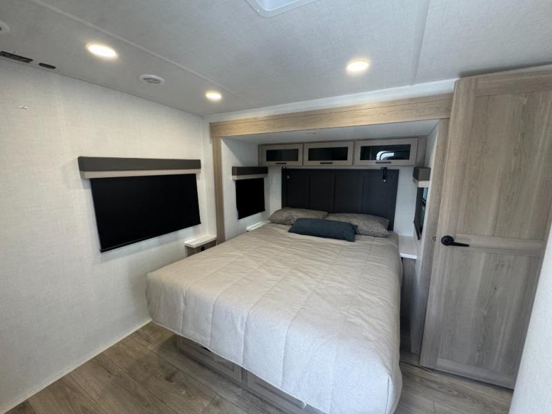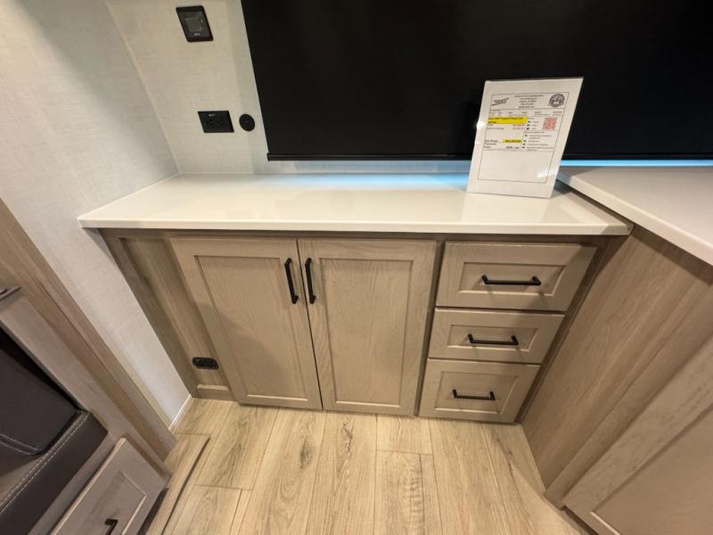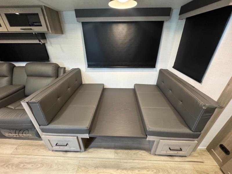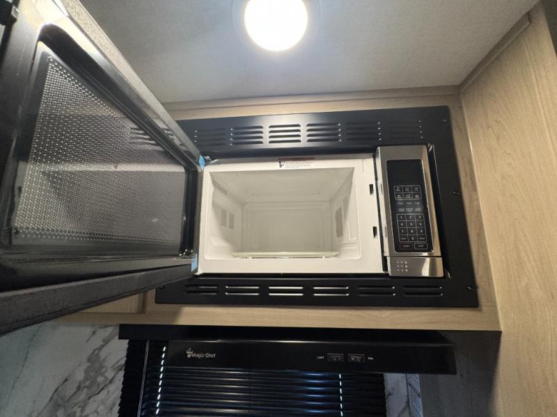 This is the perfect couples trailer with a spacious living and kitchen area and a rear bedroom which includes the second exterior entry/exit door! The bedroom also provides a slide out queen bed, a wardrobe and an optional TV, plus windows for great views and access to the double entry bathroom. The front kitchen gives the cook counter space and cabinetry for dishes and such, plus all the appliances needed to make warm meals and store leftovers. You can dine at the booth dinette, relax on the 67" theater seating and watch the Smart TV while enjoying the fireplace.